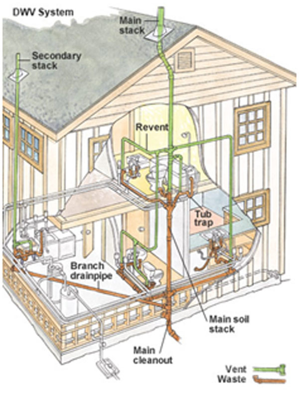 Ариун цэврийн өрөөний бохир усны хоолойн төгсгөл болон шугамын өндөр цэгүүд дээрх босоо шугам дээвэр руу нэвт гарч эвгүй үнэрийг гадагшлуулах сорох хоолойтой байна.
