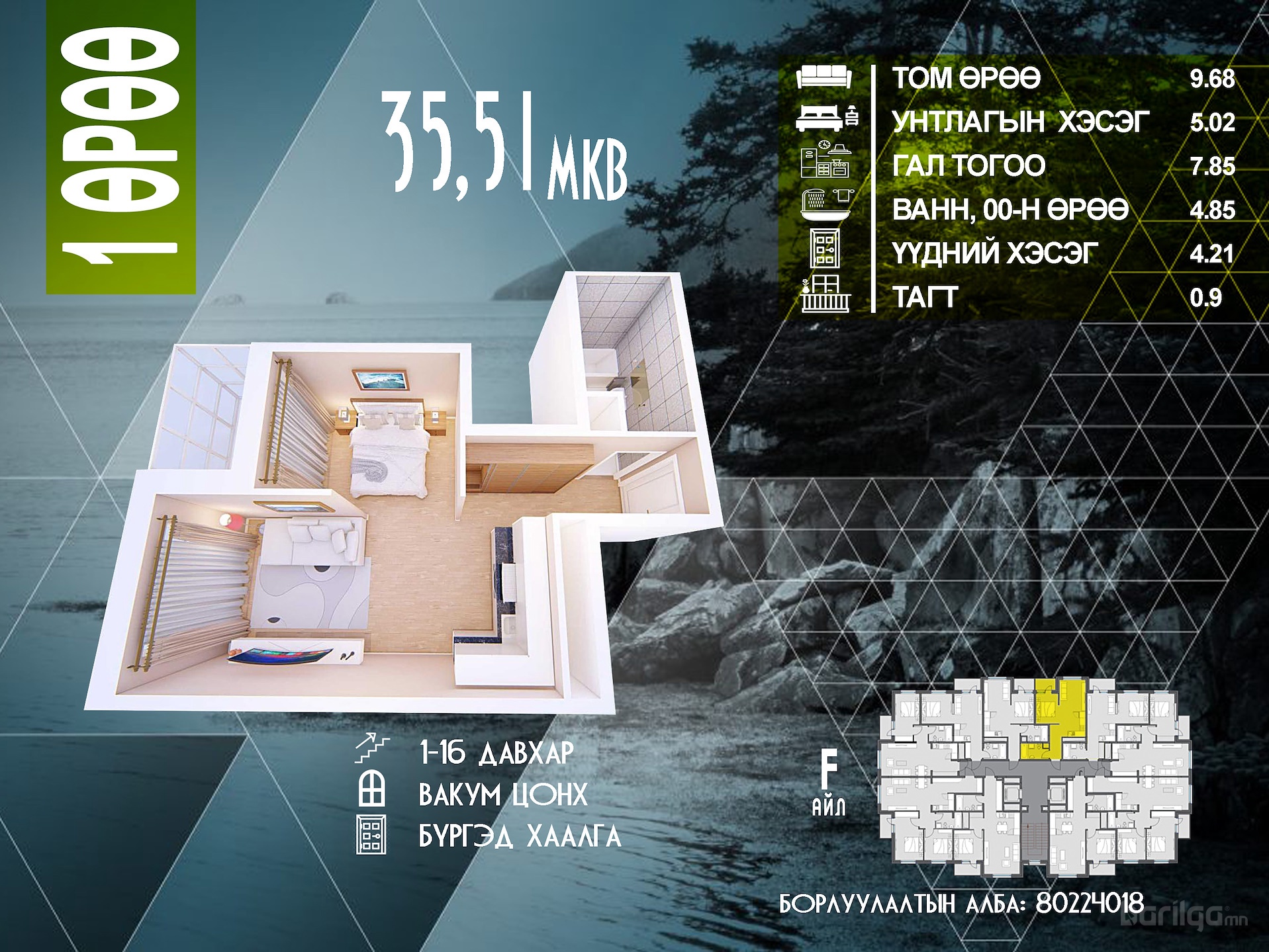 | 1 Өрөө | 35.51м2 | 2,400,000.00 | 85,223,990.00 | 1 | 1 | План зураг үзэх | Захиалга |