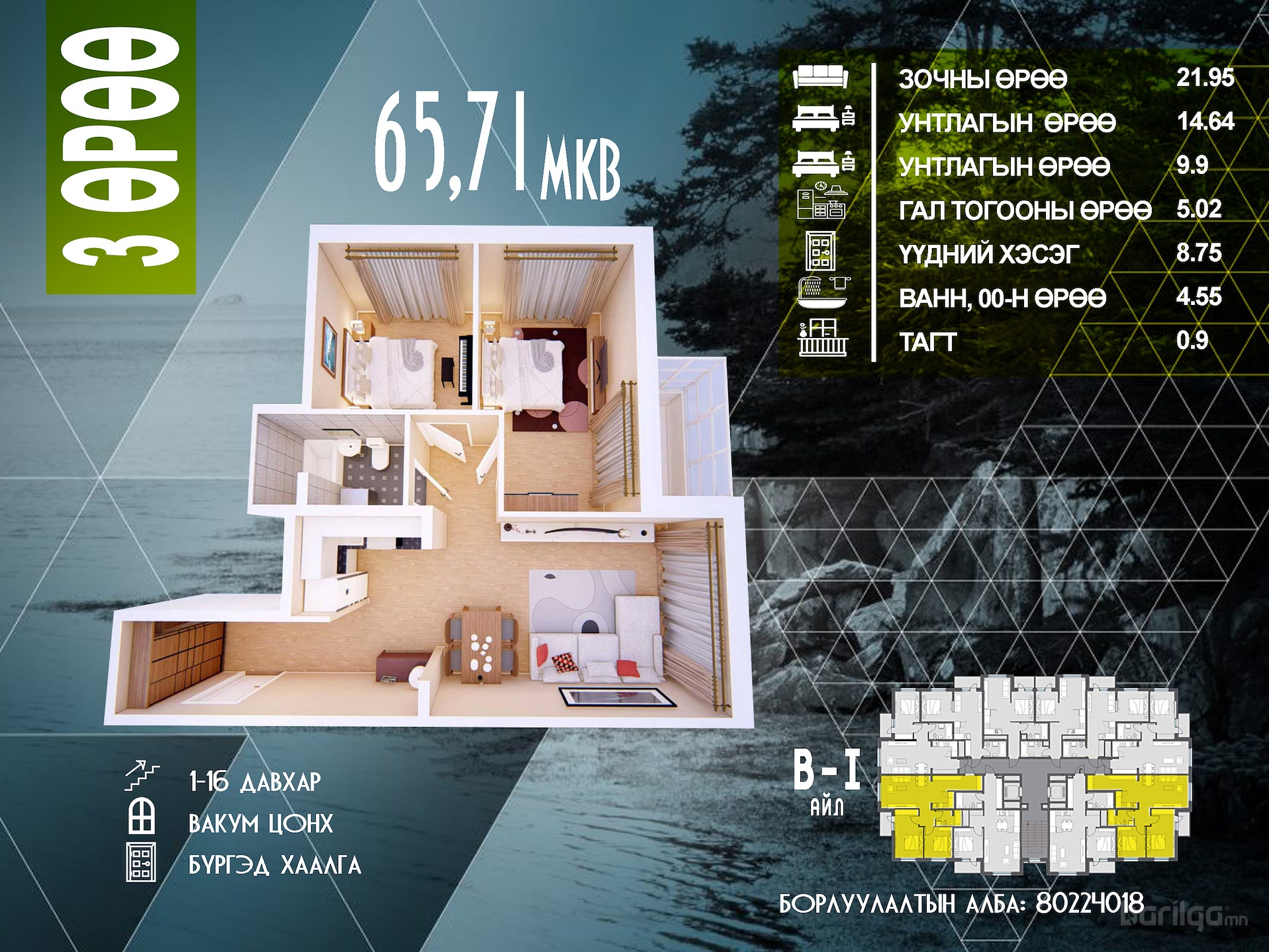| 3 Өрөө | 65.71м2 | 2,400,000.00 | 157,704,000.00 | 1 | 1 | План зураг үзэх | Захиалга |