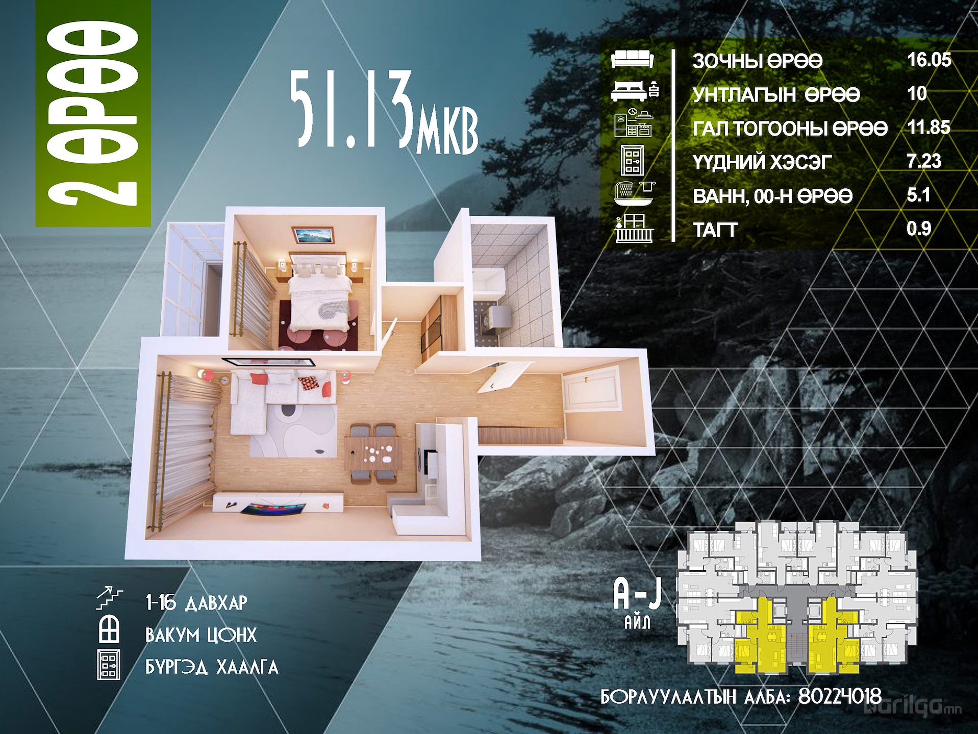 | 2 Өрөө | 51.13м2 | 2,400,000.00 | 122,712,000.00 | 1 | 1 | План зураг үзэх | Захиалга |