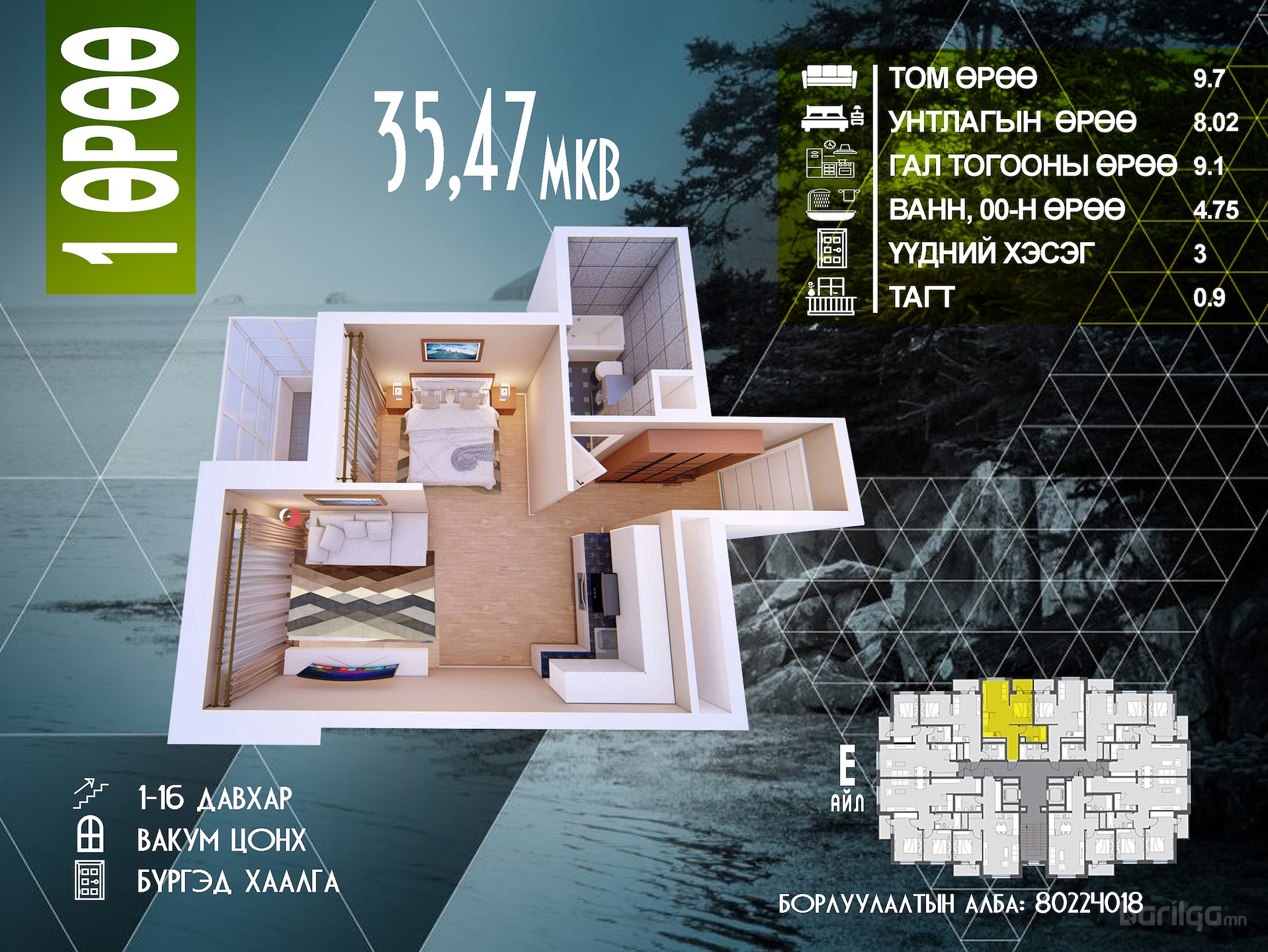 | 1 Өрөө | 35.47м2 | 2,400,000.00 | 85,128,000.00 | 1 | 1 | План зураг үзэх | Захиалга |
