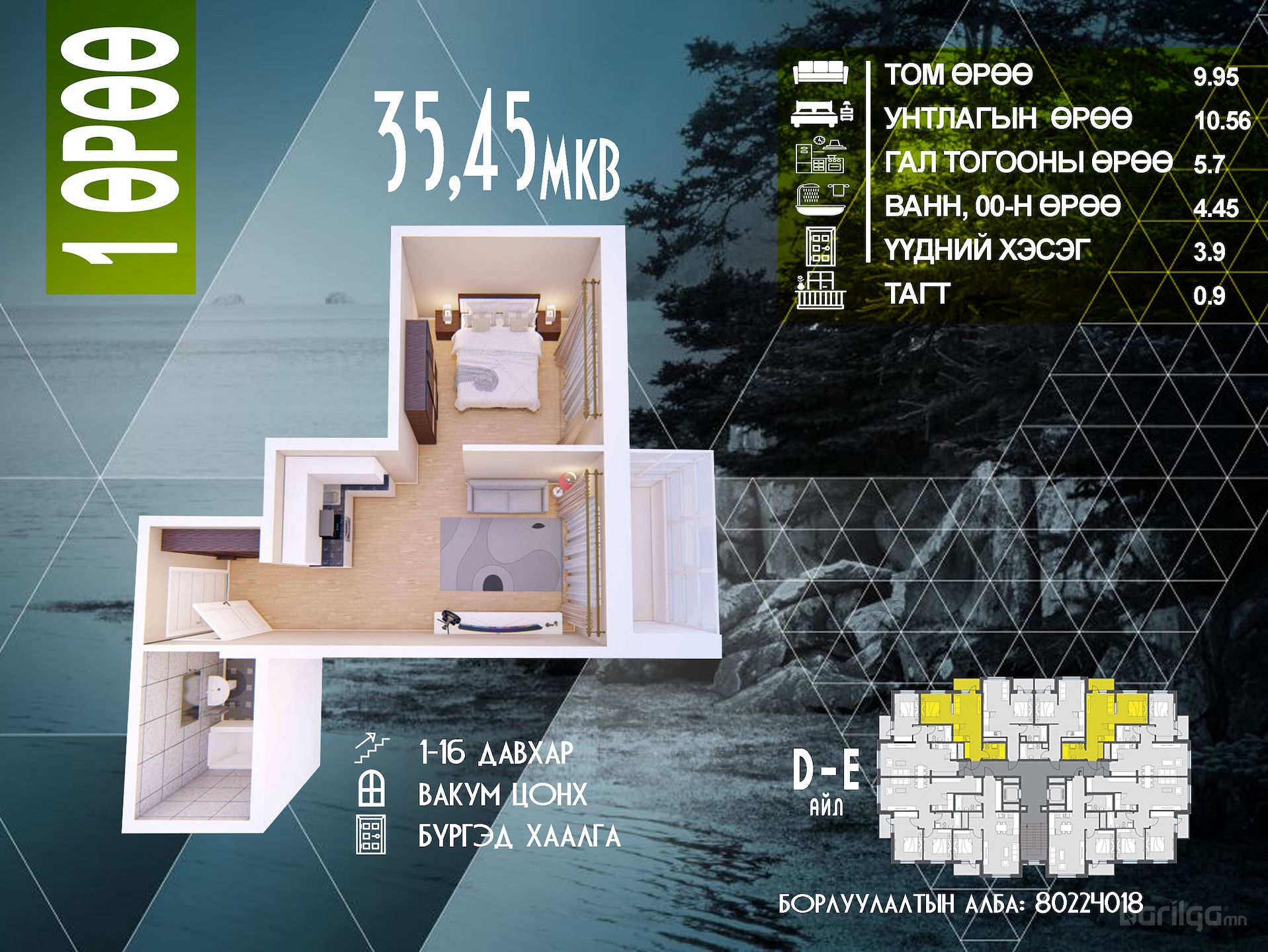 | 1 Өрөө | 35.45м2 | 2,400,000.00 | 85,080,000.00 | 1 | 1 | План зураг үзэх | Захиалга |