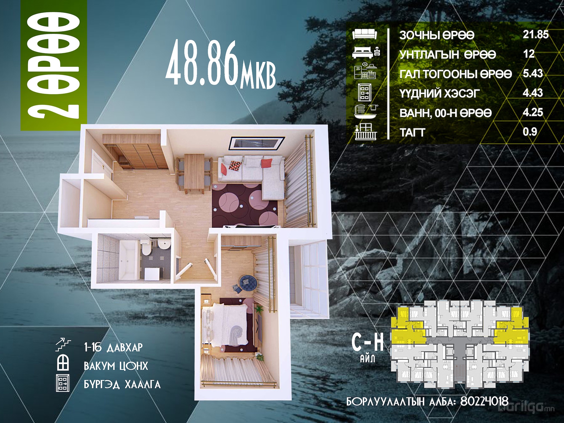 | 2 Өрөө | 48.86м2 | 2,400,000.00 | 117,264,000.00 | 1 | 1 | План зураг үзэх | Захиалга |