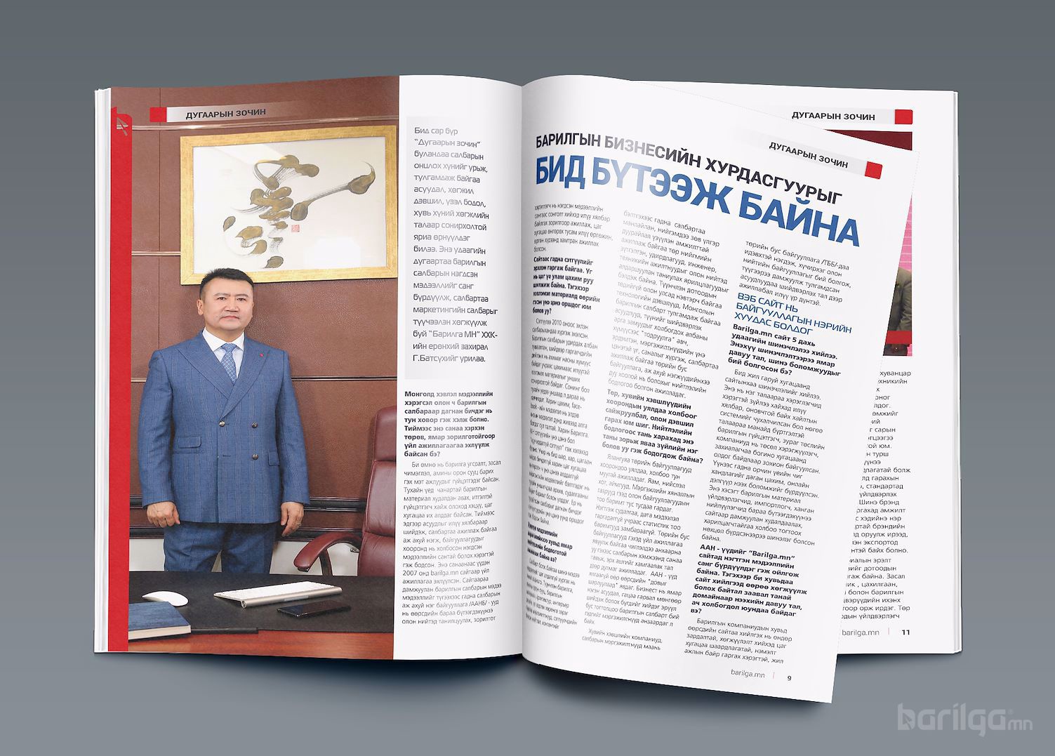 Энэ удаагийн дугаарт барилгын салбарын нэгдсэн мэдээллийн санг бүрдүүлж, салбартаа маркетингийн салбарыг түүчээлэн хөгжүүлж буй “Барилга МН” ХХК- ийн ерөнхий захирал Г.Батсүхийг онцлон урилаа. Салбараа цогцоор нь харж ажилладаг онцлогтой түүний ярилцлагаас барилгын салбарын ААНБ - ын нэгдсэн платформд хэрхэн нэгдэх, хэрхэн амжилттай маркетинг хийх талаар өргөн сэдвийн хүрээн дэхь сонирхолтой яриаг хүлээн аваарай. Ярилцлагын үргэлжлэлийг Барилга МН сэтгүүлийн 119 дэх дугаараас хүлээн авч уншина уу.