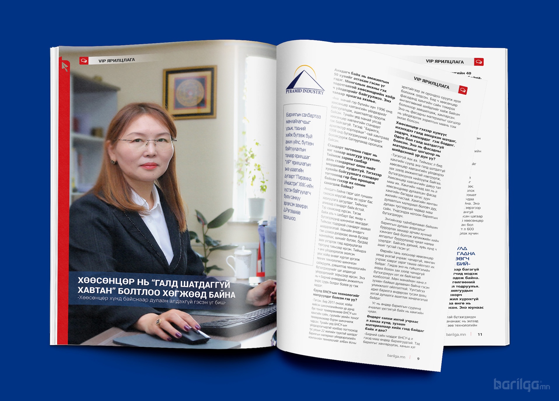 VIP ярилцлага: Барилгын салбартаа манлайлагчдыг урьж, тэдний хийж бүтээж буй ажил үйлс, бүтээн байгуулалтын талаар ярилцдаг “VIP” ярилцлагын энэ удаагийн дугаарт “Пирамид Индастри” ХХК-ийн үүсгэн байгуулагч буюу санхүү эрхэлсэн захирал Д.Рэгзэдмаа оролцлоо.