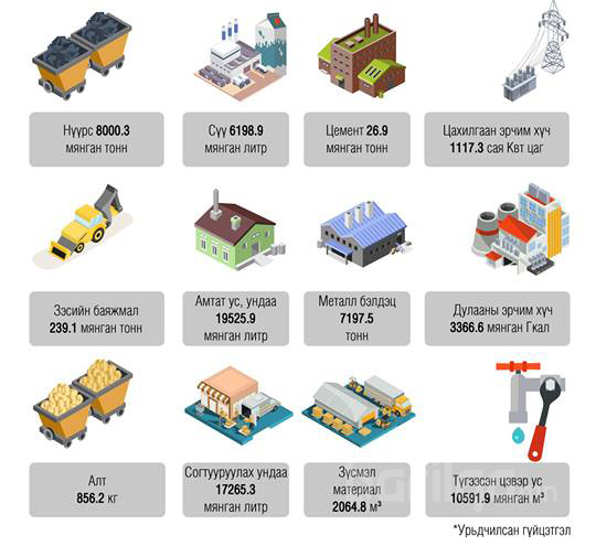 Энэ нь өмнөх оны мөн үеэс 400.3 тэрбум төгрөгөөр өссөн гэсэн үг юм. Үүнд уул уурхай, олборлох аж үйлдвэрийн нийт үйлдвэрлэл өмнөх оны мөн үеэс 331.9 (22.5%) тэрбум төгрөгөөр, үүнээс нүүрс олборлолт 338.5 (71.9%) тэрбум төгрөг, металлын хүдэр олборлолт 12.8 (1.6%) тэрбум төгрөгөөр тус тус өссөн нь голлон нөлөөлжээ.