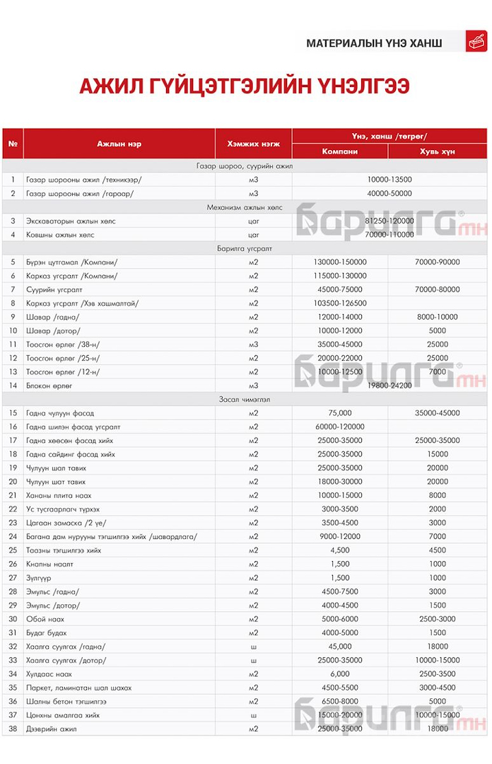 Доорх үнэ ханш нь 2019 оны 3-р сарын 13-ны өдрийн байдлаар шинэчилсэн үнэ юм. Та бүхэн үнэ ханштай холбоотой санал хүсэлтээ info@barilga.mn хаягаар ирүүлнэ үү. Сэтгүүл захиалгын утас: 77111777, 91000233