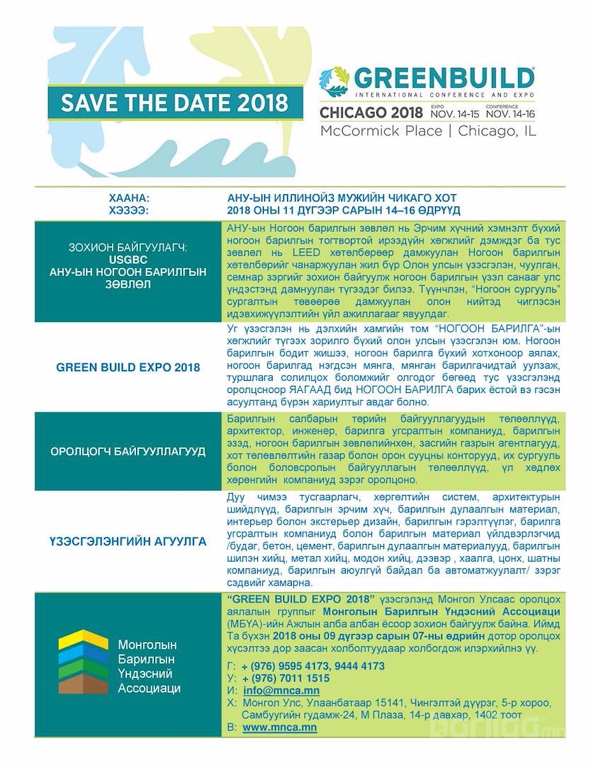 "GREENBUILD" ногоон барилгын олон улсын чуулган, үзэсгэлэн яармаг АНУ-ын Чикаого хотноо 2018 оны 11 дүгээр сарын 14-нөөс 16-ны өдрүүдэд зохион байгуулагдах гэж байна.