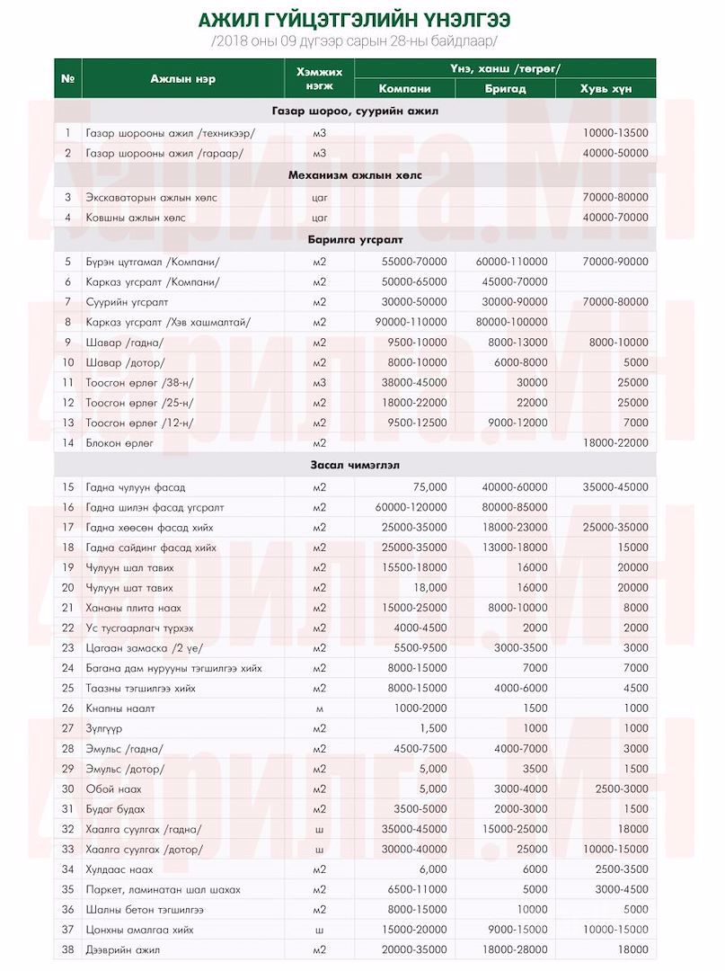 "Барилга.МН" сэтгүүлээс сар бүр хүргэдэг барилгын ажил гүйцэтгэлийн үнэ ханшийн мэдээллийг уншигч танд хүргэж байна. Илүү дэлгэрэнгүй мэдээлэл авахыг хүсвэл манай сэтгүүлийн 2018 оны 10 пугаар сарын дугаар №101-ээс үзэх боломжтой.