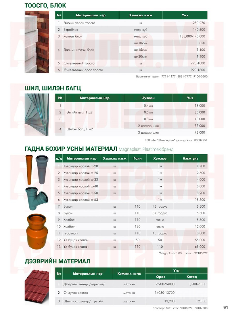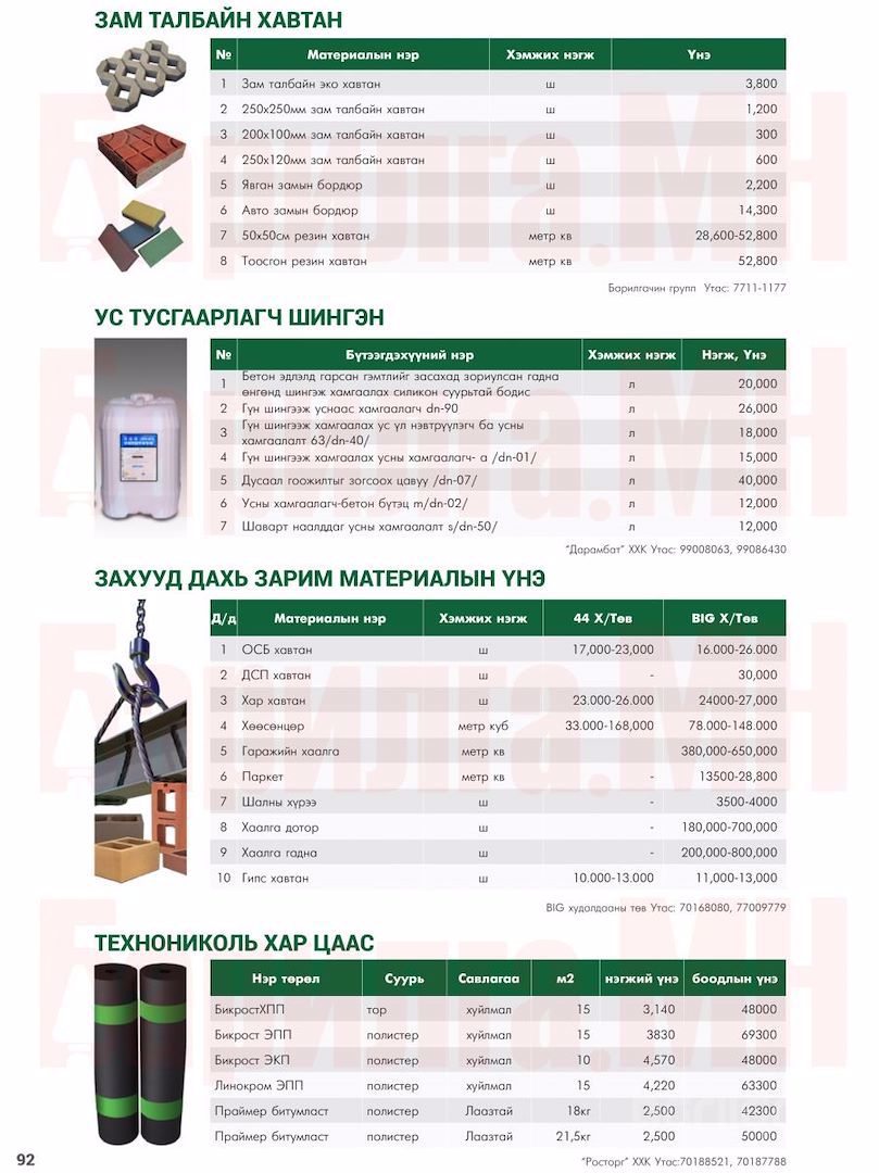 сэтгүүлээс сар бүр хүргэдэг барилгын материалын үнэ ханшийн мэдээллийг уншигч танд хүргэж байна. Илүү дэлгэрэнгүй мэдээлэл авахыг хүсвэл манай сэтгүүлийн 2018 оны 10-р сарын дугаар