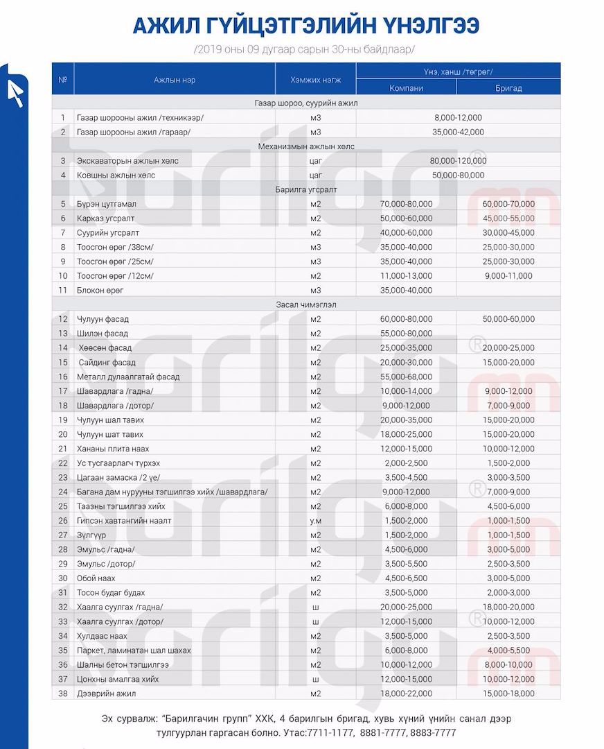 "Барилга.МН" сэтгүүлээс сар бүр хүргэдэг барилгын ажил гүйцэтгэлийн үнэ ханшийн мэдээллийг уншигч танд хүргэж байна. Илүү дэлгэрэнгүй мэдээлэл авахыг хүсвэл манай сэтгүүлийн 2019 оны 10 сарын дугаар №113-аас үзэх боломжтой. Доорх үнэ ханш нь 2019 оны 10-р сарын 20-ны өдрийн байдлаар шинэчилсэн үнэ. Та бүхэн үнэ ханштай холбоотой санал хүсэлтээ info@barilga.mn хаягаар ирүүлнэ үү.