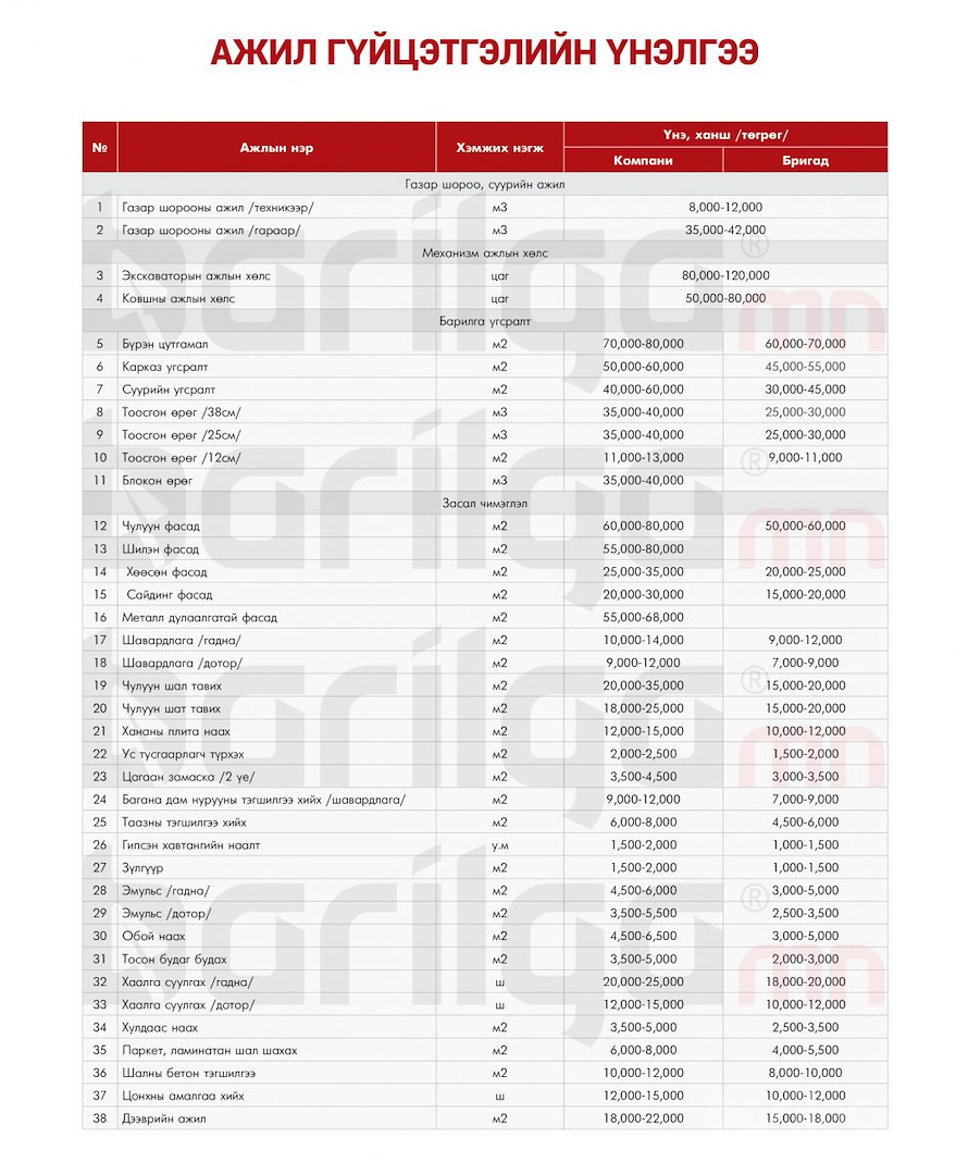 Барилга.МН" сэтгүүлээс сар бүр хүргэдэг барилгын ажил гүйцэтгэлийн үнэ ханшийн мэдээллийг уншигч танд хүргэж байна. Илүү дэлгэрэнгүй мэдээлэл авахыг хүсвэл манай сэтгүүлийн 2019 оны 8 сарын дугаар №111-ээс үзэх боломжтой. Доорх үнэ ханш нь 2019 оны 8-р сарын 10-ны өдрийн байдлаар шинэчилсэн үнэ. Та бүхэн үнэ ханштай холбоотой санал хүсэлтээ info@barilga.mn хаягаар ирүүлнэ үү. БАРИЛГА.МН Сэтгүүл бүтэн жилийн захиалга 66000₮