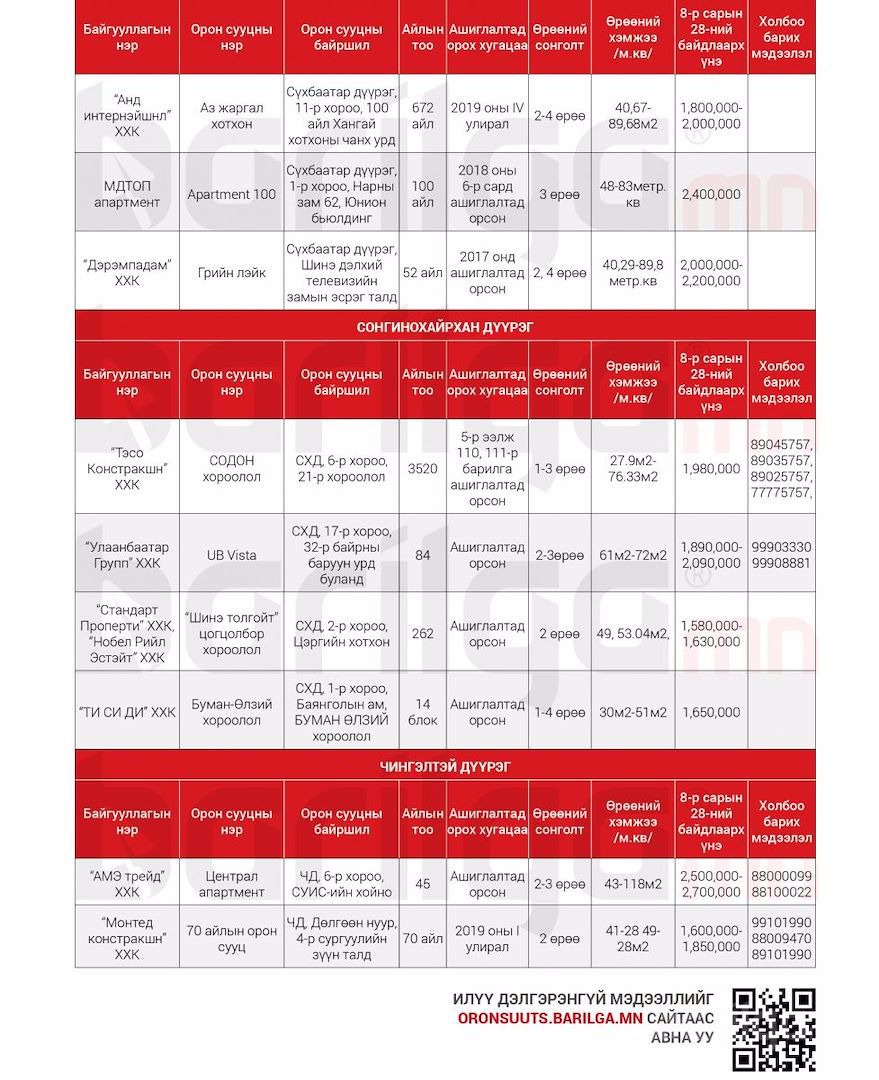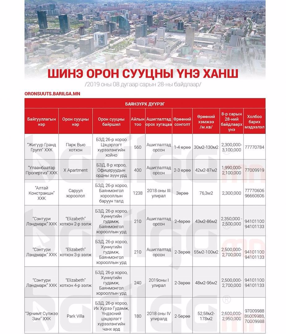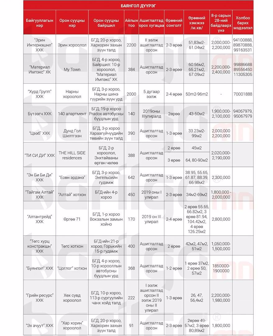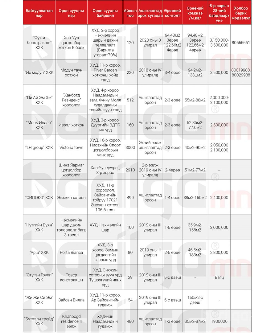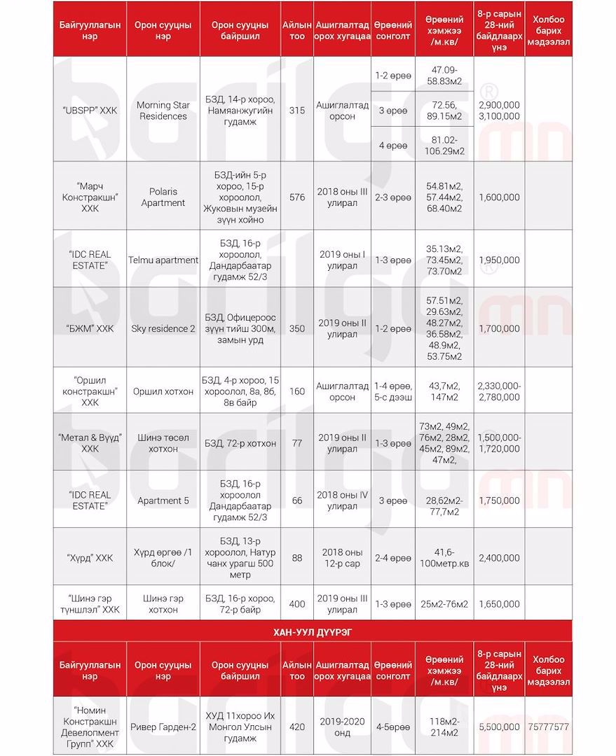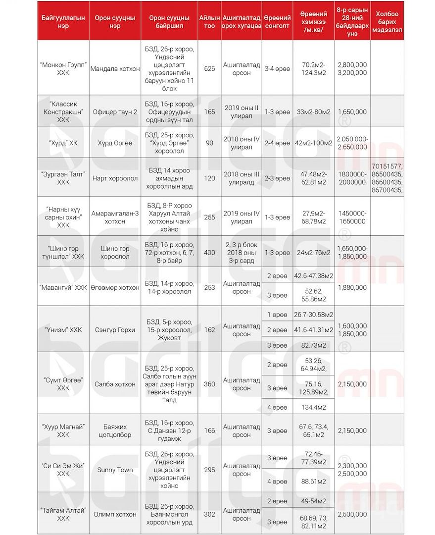 Улаанбаатар хотод захиалга авч буй Шинэ Орон Сууцны мэдээлэл 9сар