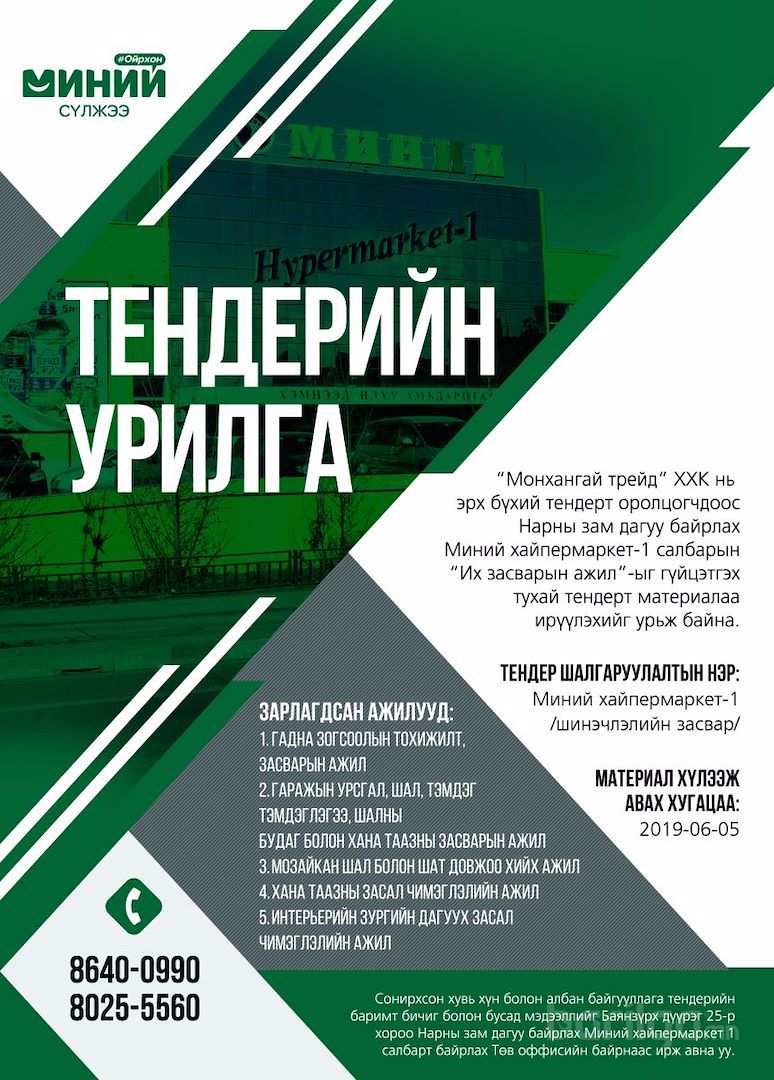 “Монхангай трейд” ХХК нь эрх бүхий тендерт оролцогчдоос Нарны зам дагуу байрлах Миний хайпермаркет-1 салбарын “Их засварын ажил”-ыг гүйцэтгэх тухай тендерт материалаа ирүүлэхийг урьж байна.