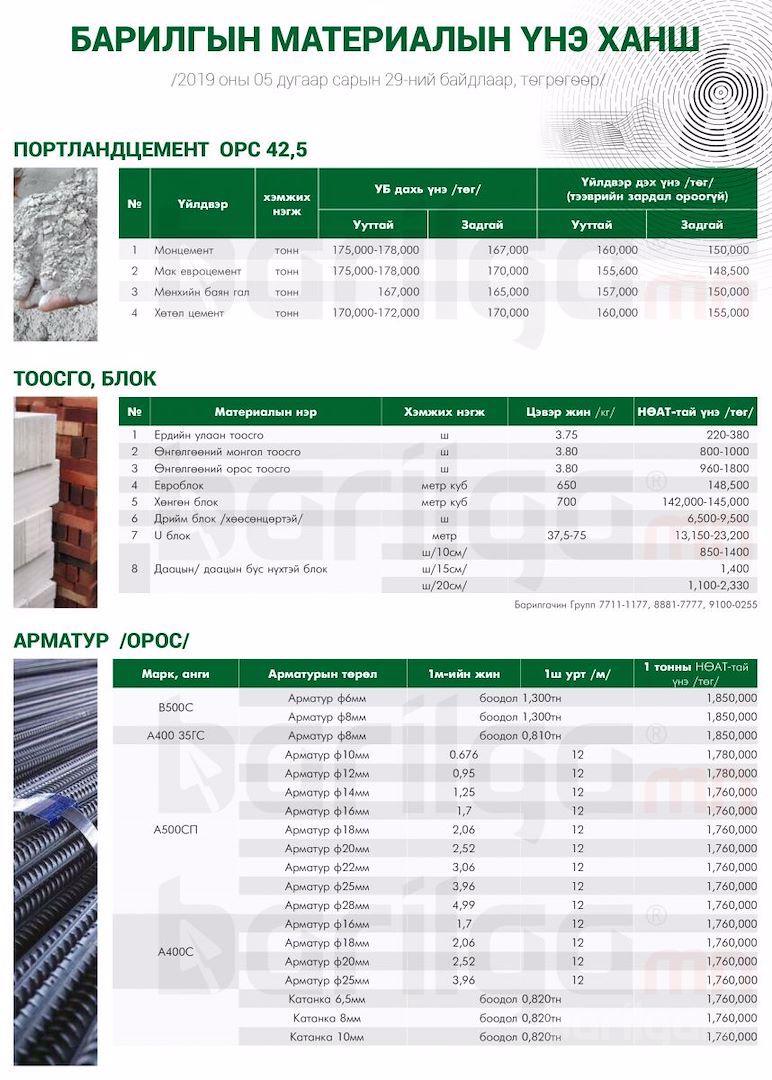 сэтгүүлээс сар бүр хүргэдэг барилгын материалын үнэ ханшийн мэдээллийг уншигч танд хүргэж байна. Илүү дэлгэрэнгүй мэдээлэл авахыг хүсвэл манай сэтгүүлийн 2019 оны 6-р сарын дугаар