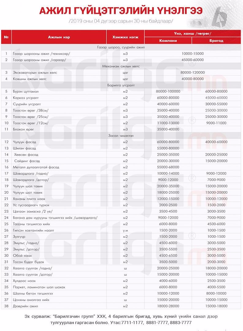 Барилга.МН" сэтгүүлээс сар бүр хүргэдэг барилгын ажил гүйцэтгэлийн үнэ ханшийн мэдээллийг уншигч танд хүргэж байна. Илүү дэлгэрэнгүй мэдээлэл авахыг хүсвэл манай сэтгүүлийн 2019 оны 5 сарын дугаар №108-аас үзэх боломжтой.
