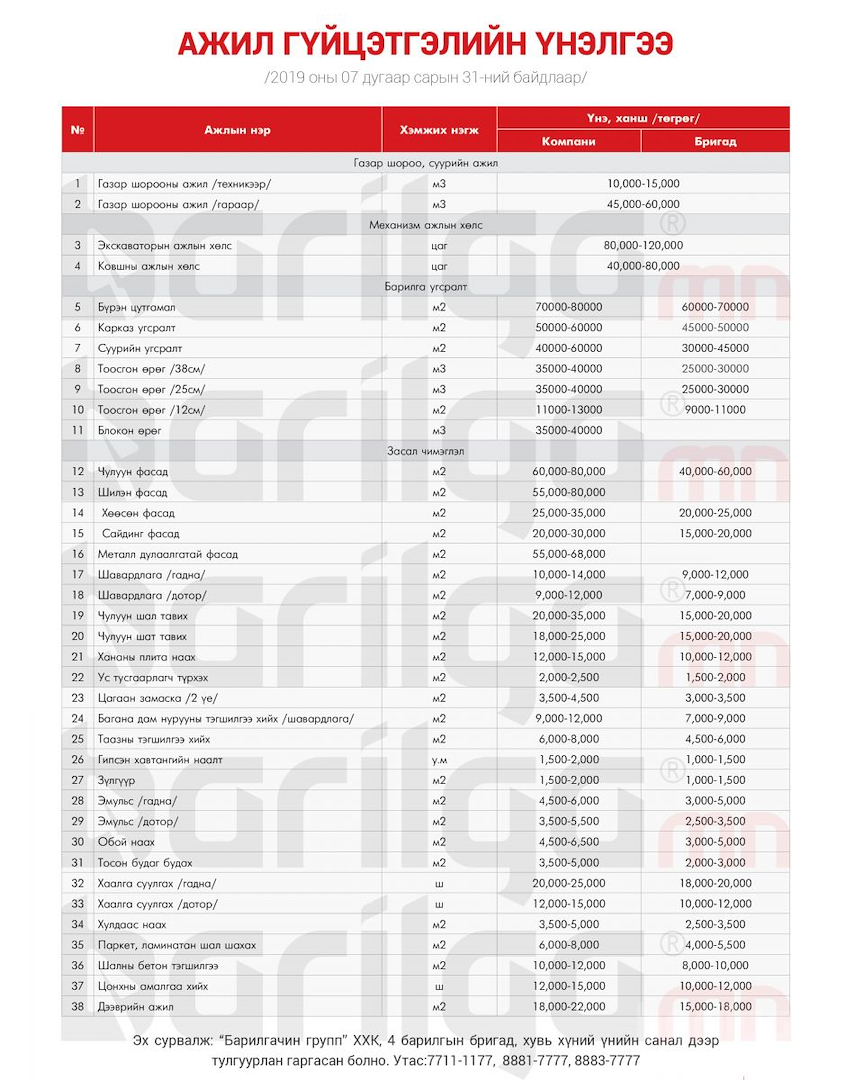 Барилга.МН" сэтгүүлээс сар бүр хүргэдэг барилгын ажил гүйцэтгэлийн үнэ ханшийн мэдээллийг уншигч танд хүргэж байна. Илүү дэлгэрэнгүй мэдээлэл авахыг хүсвэл манай сэтгүүлийн 2019 оны 8 сарын дугаар №111-ээс үзэх боломжтой. Доорх үнэ ханш нь 2019 оны 8-р сарын 10-ны өдрийн байдлаар шинэчилсэн үнэ. Та бүхэн үнэ ханштай холбоотой санал хүсэлтээ info@barilga.mn хаягаар ирүүлнэ үү. "Барилга.МН" сэтгүүлийг "Номин", "Оргил" сүлжээ дэлгүүрийн салбарууд, номын дэлгүүрүүд, сонин сэтгүүл борлуулах цэгүүдээс худалдан аваарай. Сэтгүүл захиалгын утас: 77111777, 91000233