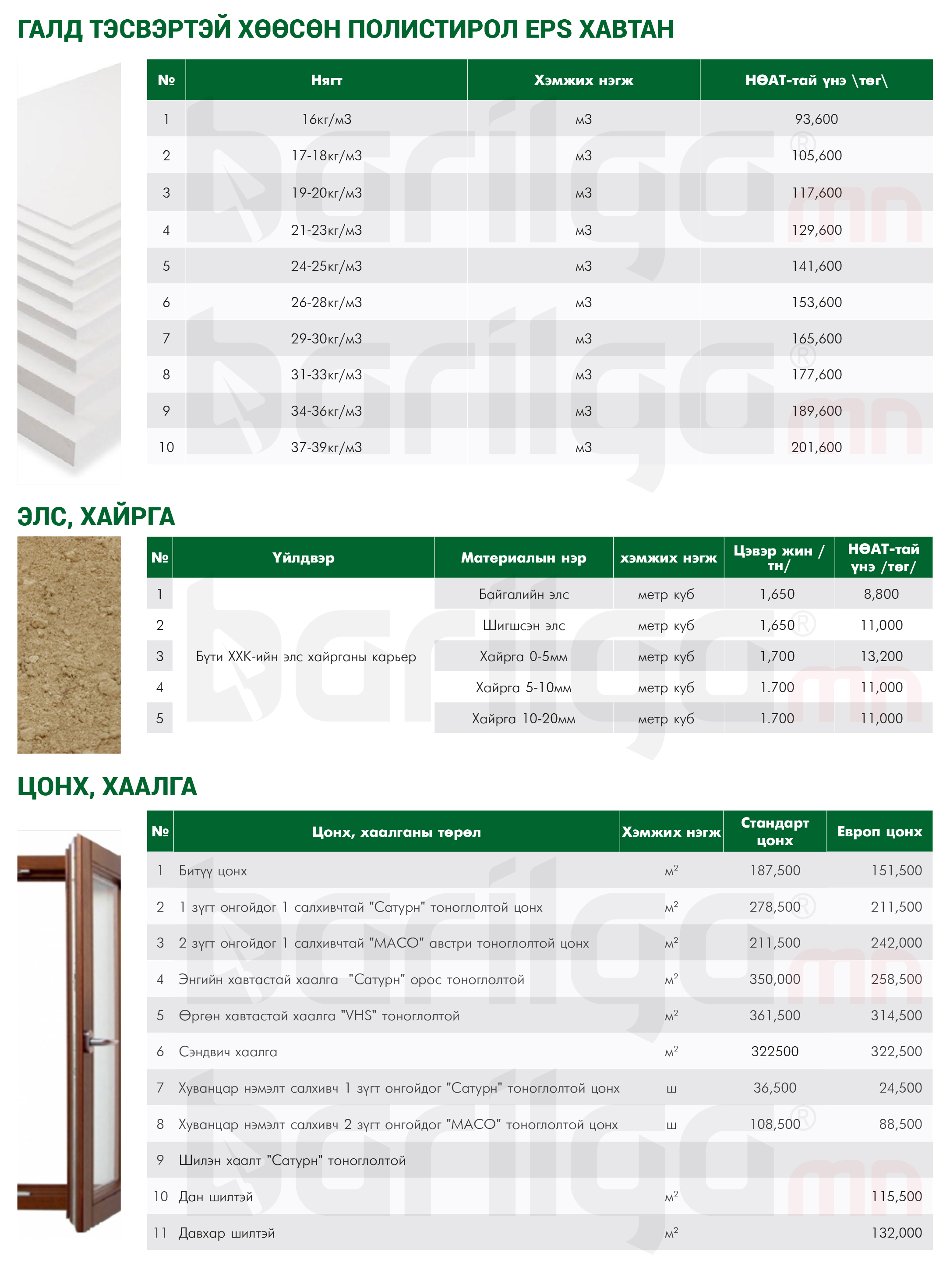 Доорх үнэ ханш нь 2019 оны 6-р сарын 1-ний өдрийн байдлаар шинэчилсэн үнэ юм. Та бүхэн үнэ ханштай холбоотой санал хүсэлтээ info@barilga.mn хаягаар ирүүлнэ үү. Сэтгүүл захиалгын утас: 77111777, 91000233