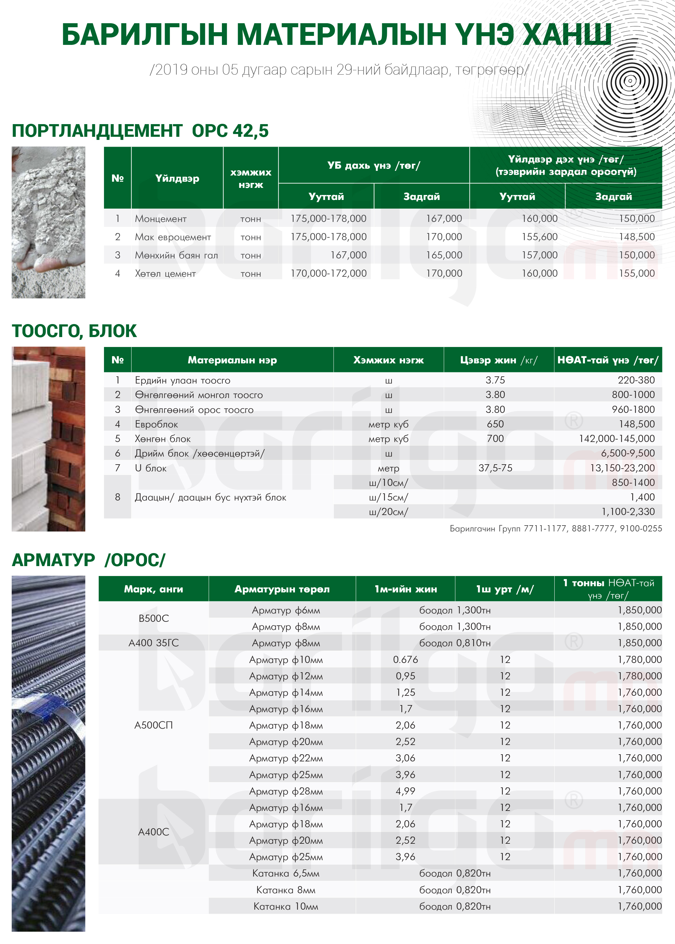 "Барилга.МН" сэтгүүлээс сар бүр хүргэдэг барилгын материалын үнэ ханшийн мэдээллийг уншигч танд хүргэж байна. Илүү дэлгэрэнгүй мэдээлэл авахыг хүсвэл манай сэтгүүлийн 2019 оны 6-р сарын дугаар №109-өөс үзэх боломжтой.