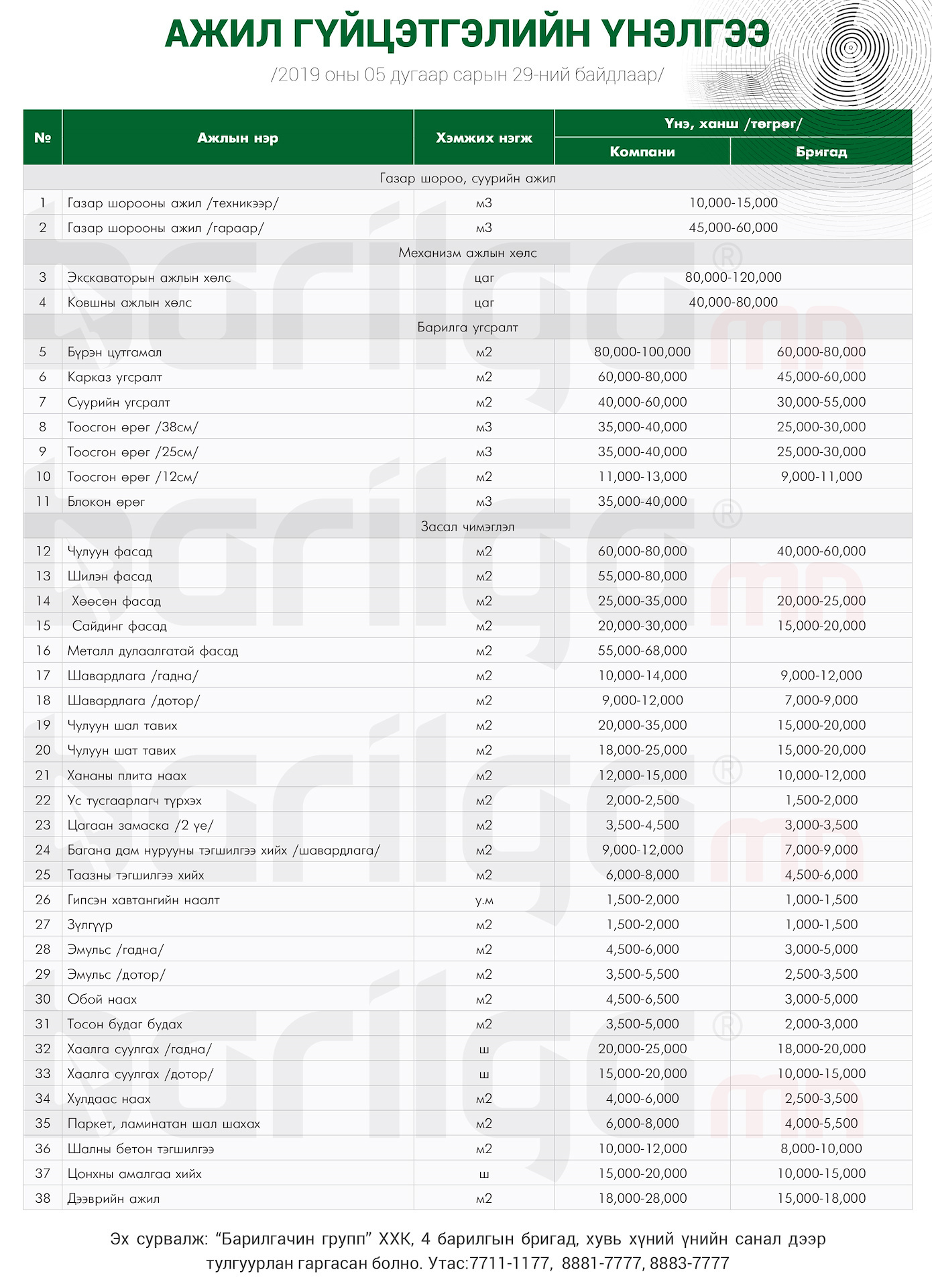 Та бүхэн үнэ ханштай холбоотой санал хүсэлтээ info@barilga.mn хаягаар ирүүлнэ үү.