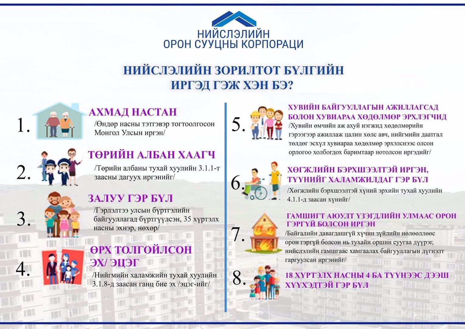 м бүртгэлийг Энгийн түрээс болон түрээслээд өмчлөх гэсэн 2 хэлбэрээр зорилтот бүлэг буюу Ахмад настан, Төрийн албан хаагч, Залуу гэр бүл, Хувийн байгууллагын ажиллагсад болон хувиараа хөдөлмөр эрхлэгч, 18 хүртэлх насны 4 ба түүнээс дээш хүүхэдтэй гэр бүл, Хөгжлийн бэрхшээлтэй иргэн болон түүнийг халамжилдаг гэр бүл, Гамшигт аюул үзэгдлийн улмаас орон гэргүй болсон иргэд гэсэн 8 бүлгийн дагуу явуулна. Цаашлаад Нийслэл Улаанбаатар хотын агаар хөрсний бохирдлыг бодитойгоор бууруулах үүднээс бүртгэлд хамрагдах иргэд нь Улаанбаатар хотын харъяалалтай байх, гэр хорооллын агаарын чанарын бүсчлэлд оршин суудаг, өөрийн өмчлөлийн орон сууцгүй байх гэх мэт үндсэн шаардлагуудыг тавьж байгаа.