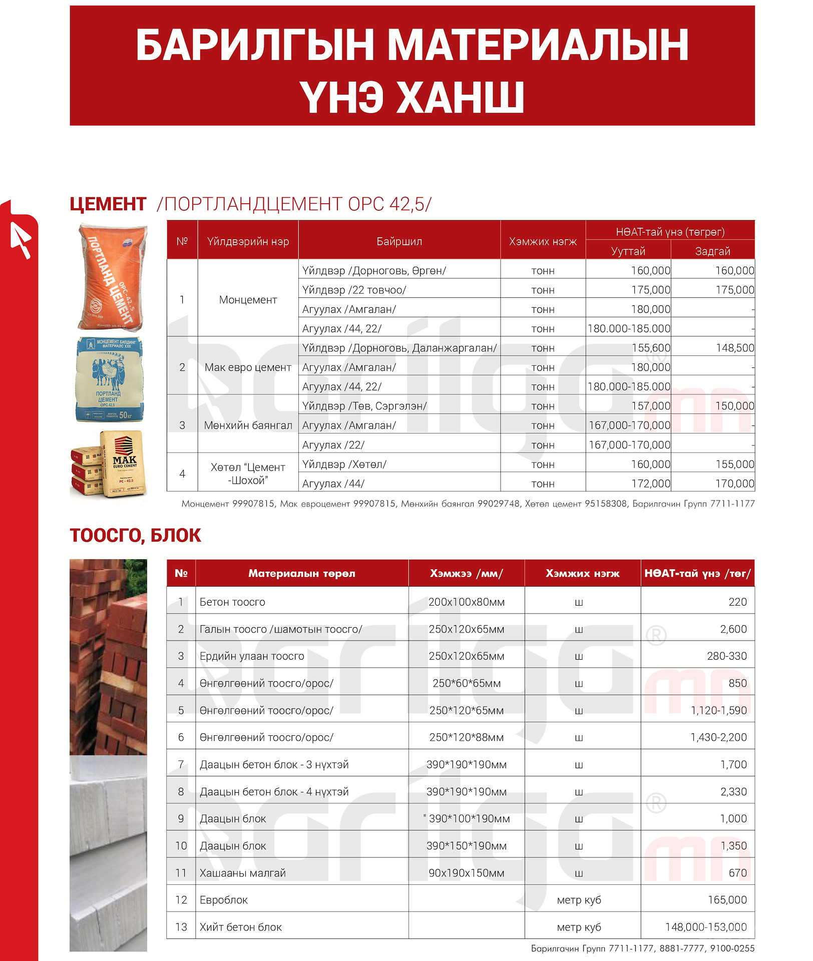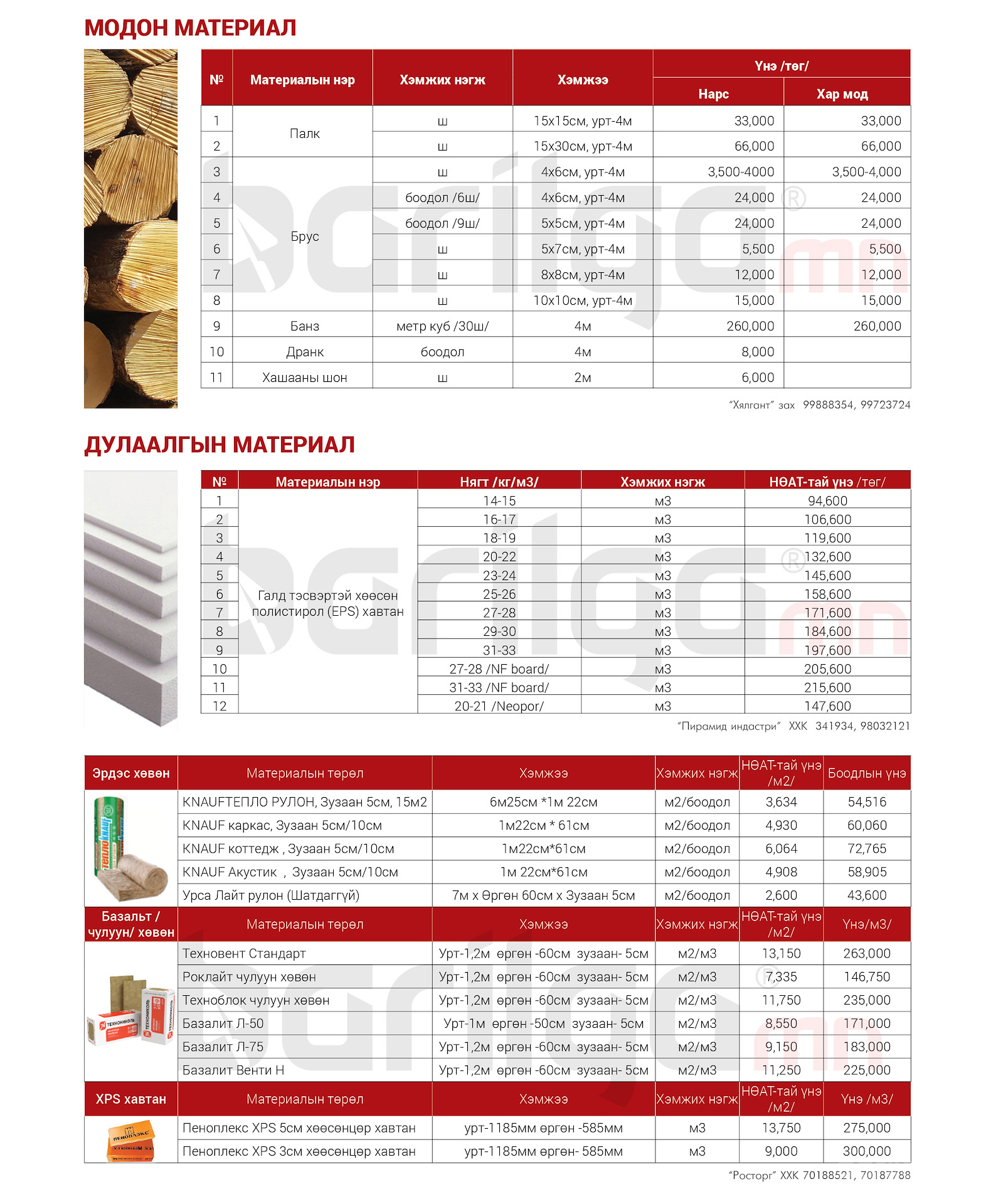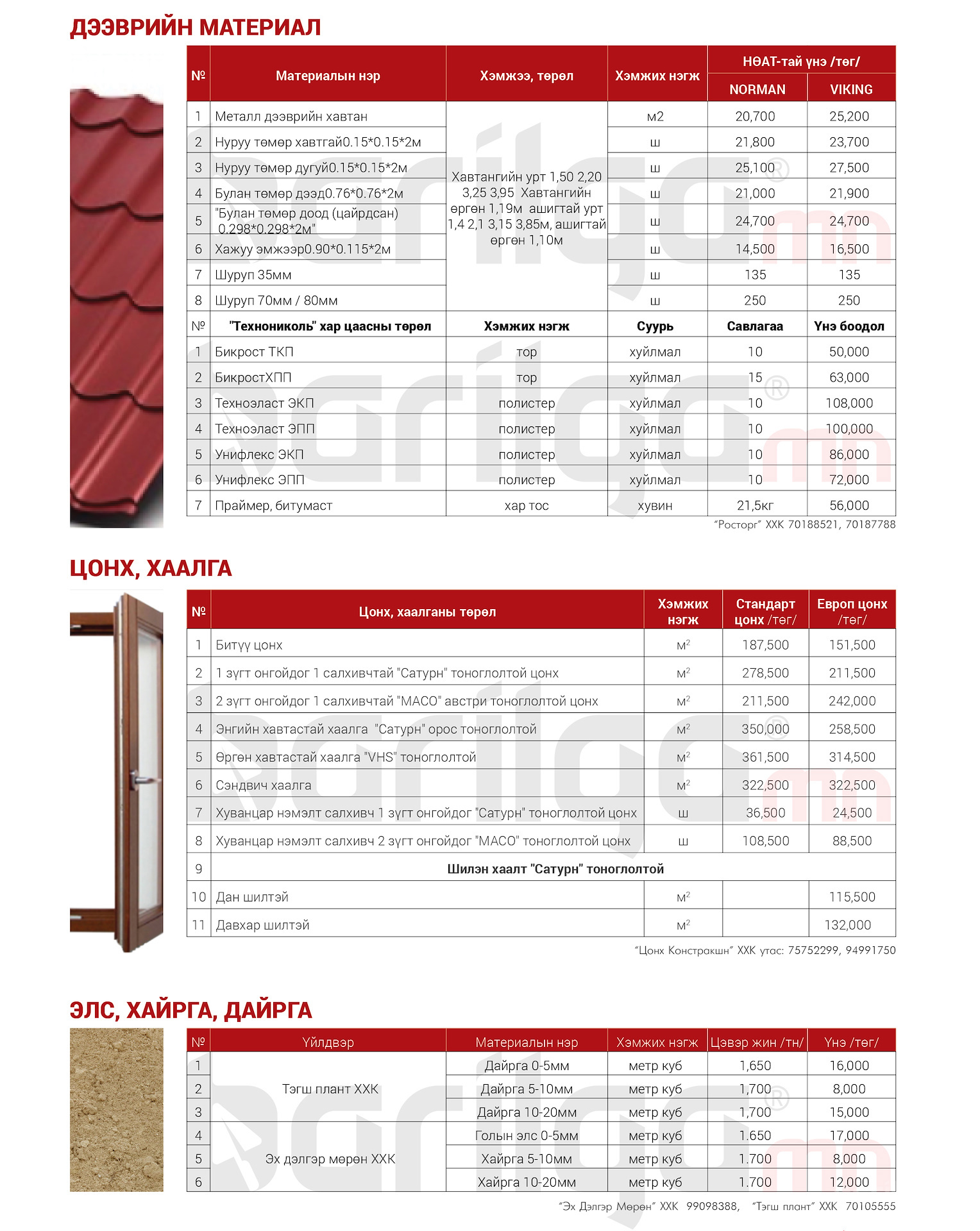 "Барилга.МН" сэтгүүлээс сар бүр хүргэдэг барилгын материалын үнэ ханшийн мэдээллийг уншигч танд хүргэж байна. Илүү дэлгэрэнгүй мэдээлэл авахыг хүсвэл манай сэтгүүлийн 2019 оны 11-р сарын дугаар №114-өөс үзэх боломжтой.