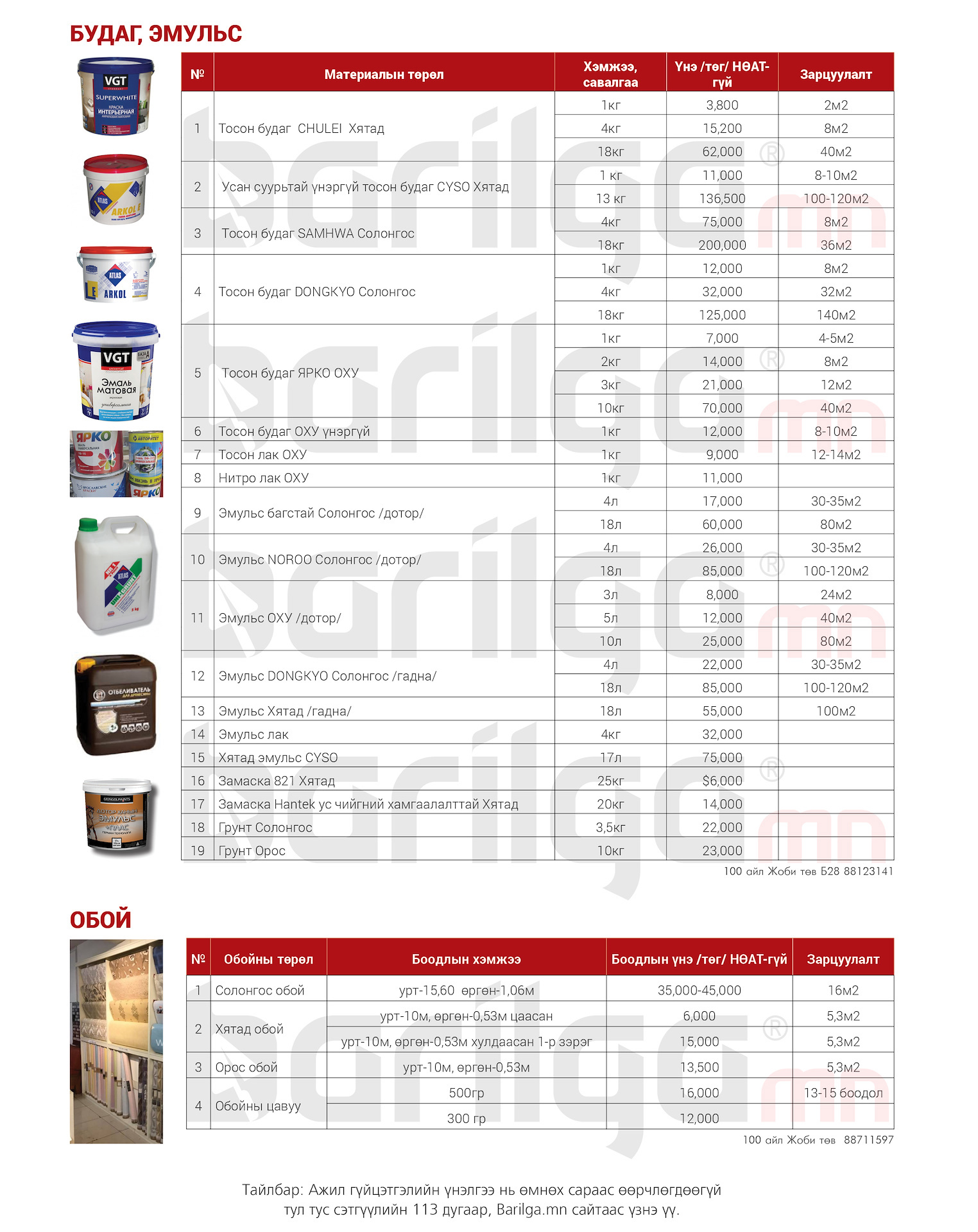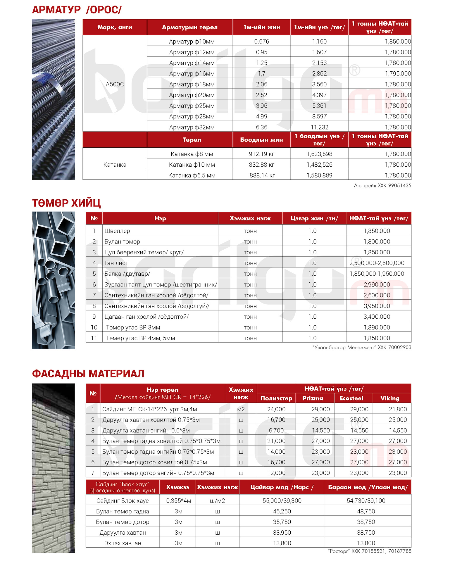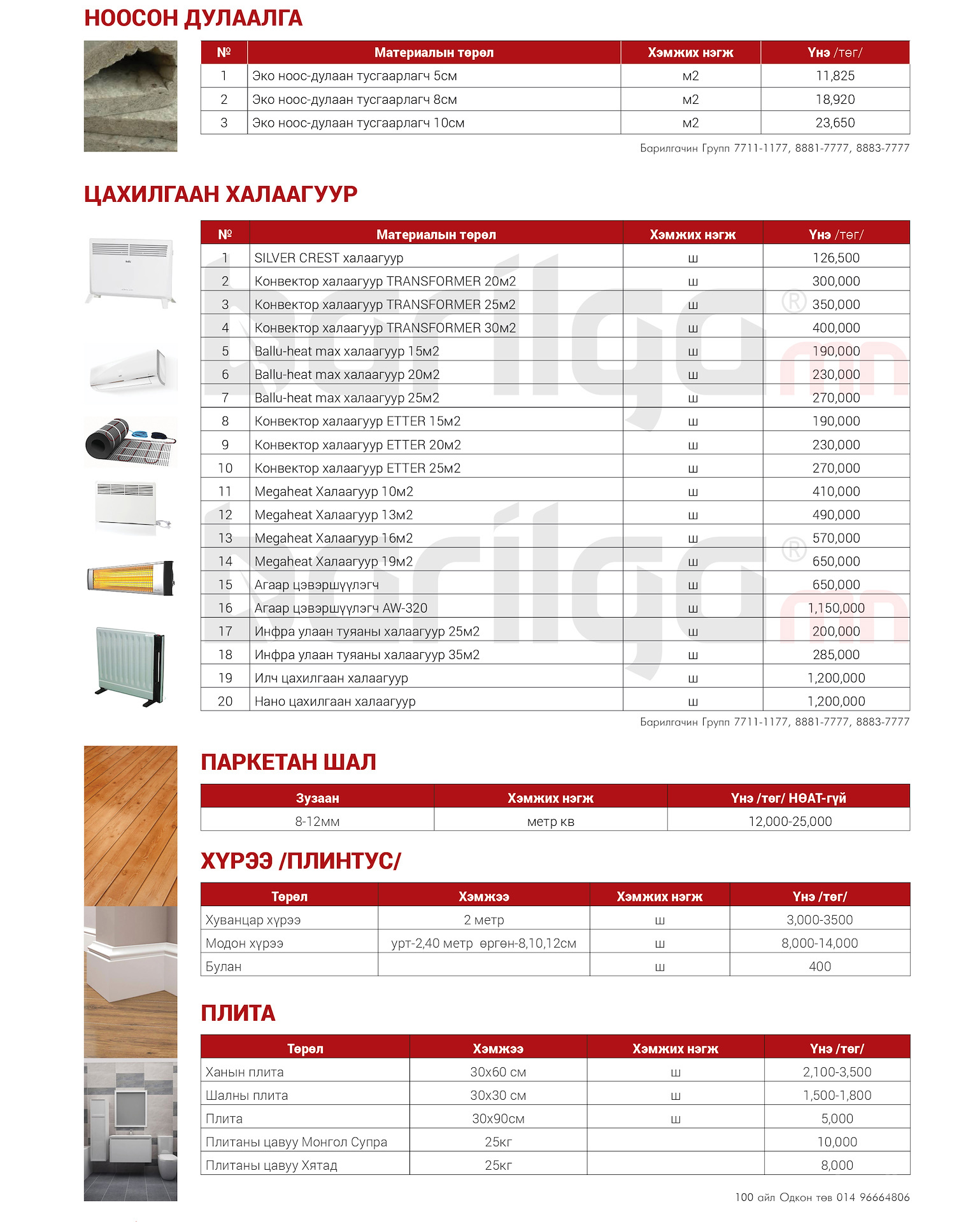 "Барилга.МН" сэтгүүлээс сар бүр хүргэдэг барилгын материалын үнэ ханшийн мэдээллийг уншигч танд хүргэж байна. Илүү дэлгэрэнгүй мэдээлэл авахыг хүсвэл манай сэтгүүлийн 2019 оны 11-р сарын дугаар №114-өөс үзэх боломжтой.