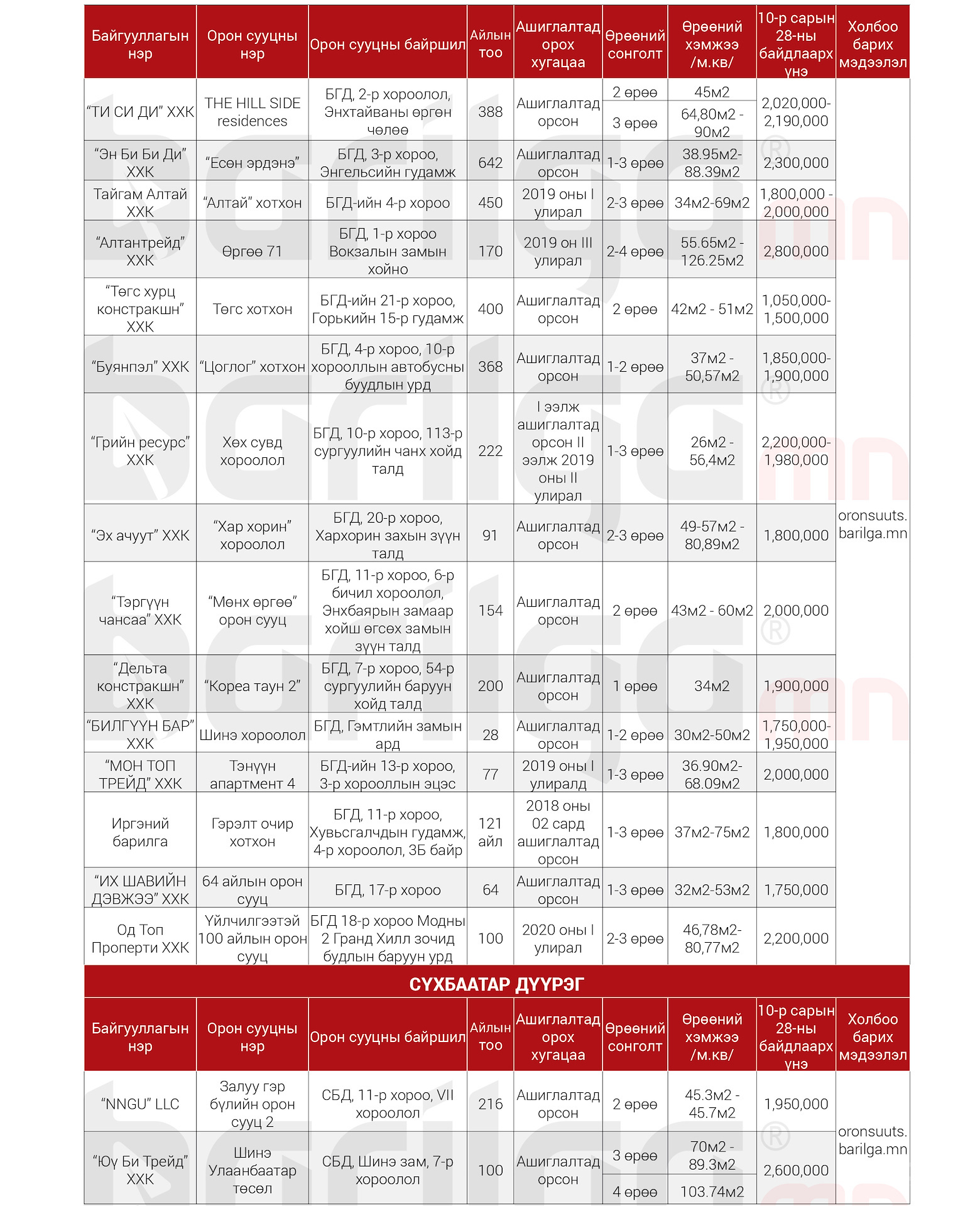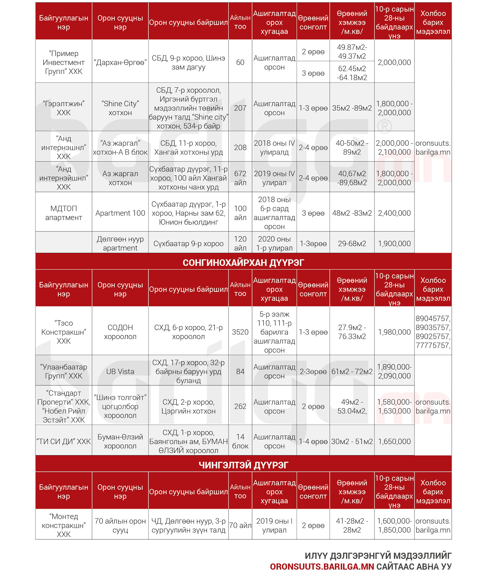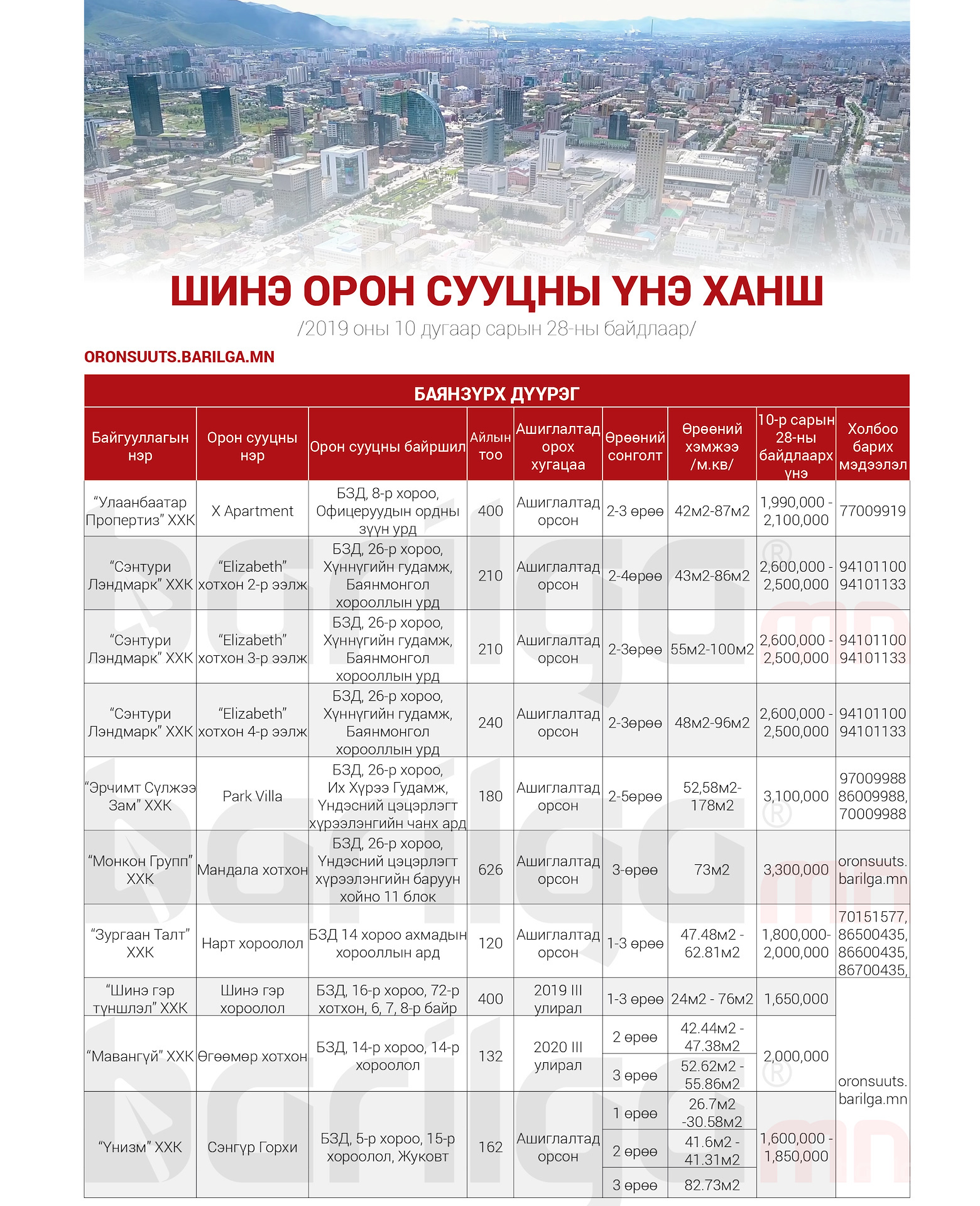 "Барилга.МН" сэтгүүлээс сар бүр хүргэдэг ШИНЭ ОРОН СУУЦНЫ үнэ ханшийн мэдээллийг танд хүргэж байна. Илүү дэлгэрэнгүй мэдээлэл авахыг хүсвэл манай сэтгүүлийн 2019 оны 11 сарын дугаар №114-өөс үзэх боломжтой.