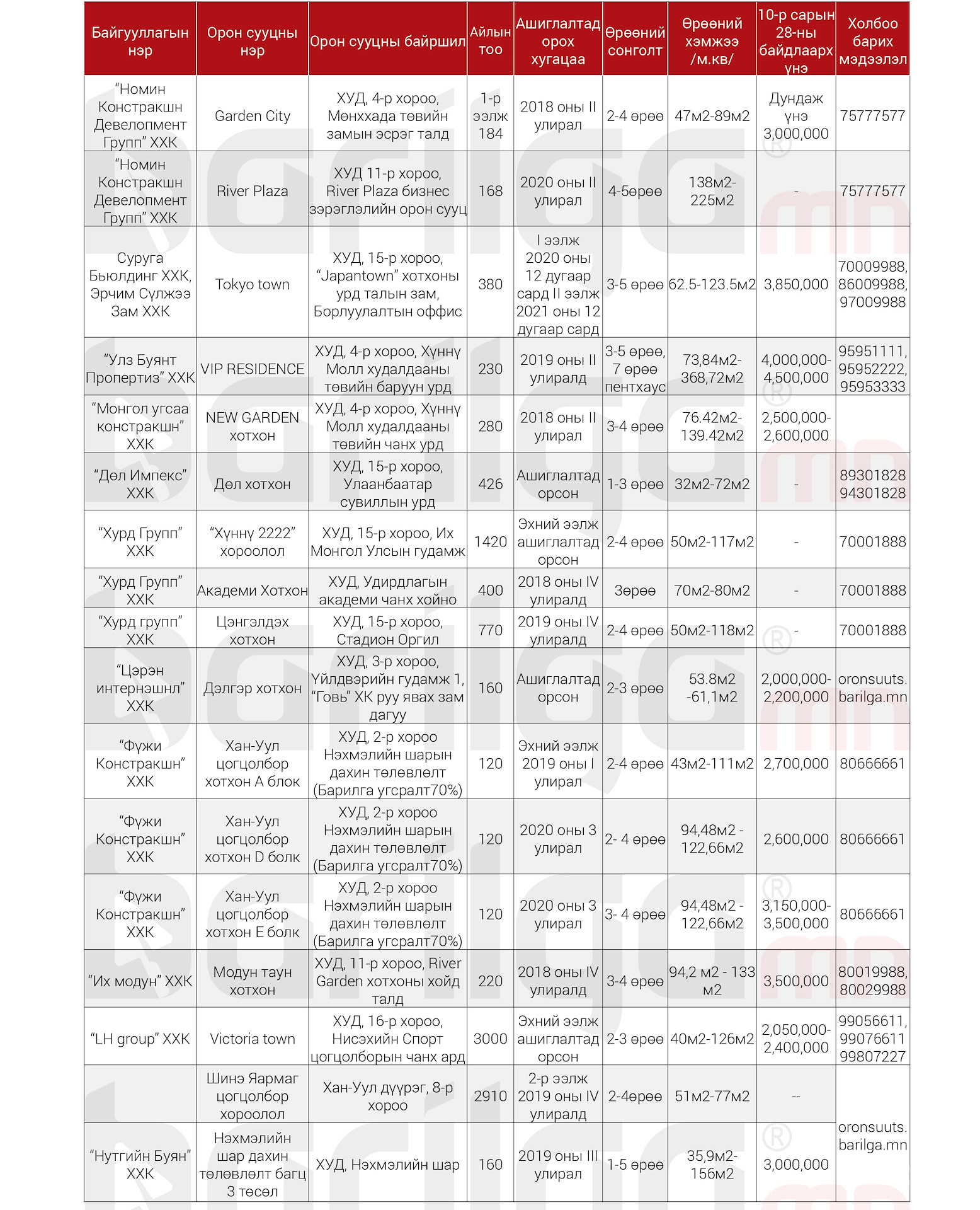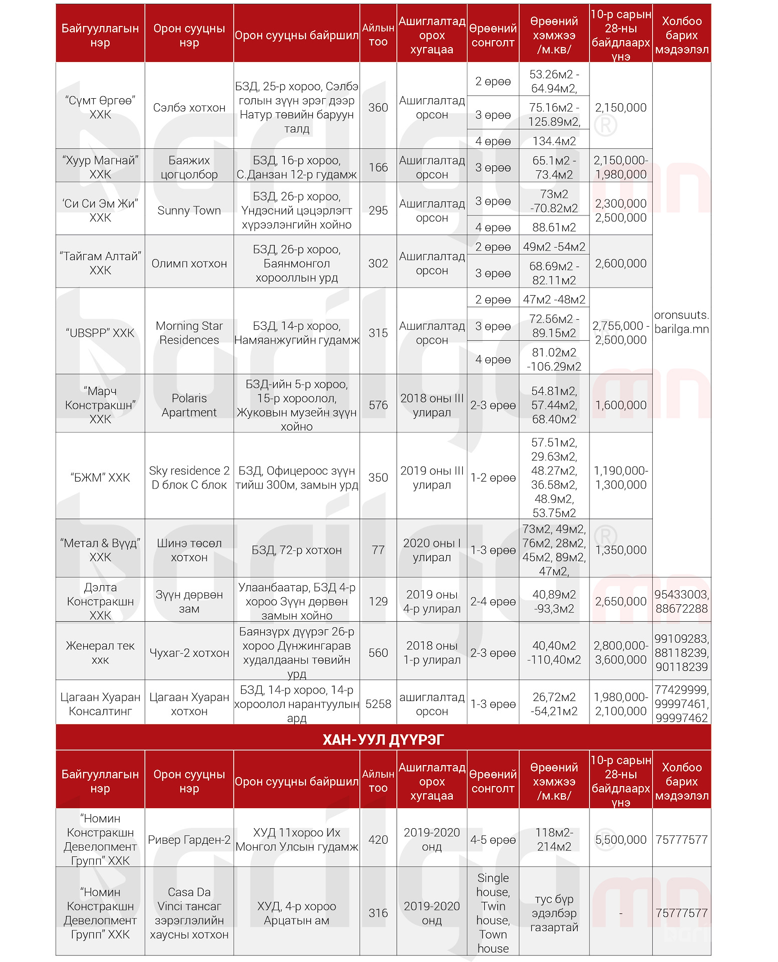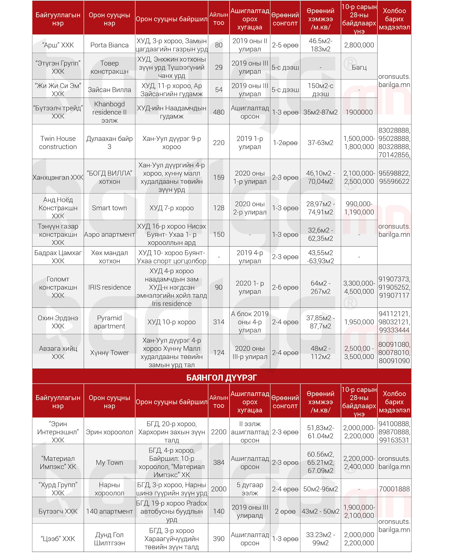 "Барилга.МН" сэтгүүлээс сар бүр хүргэдэг ШИНЭ ОРОН СУУЦНЫ үнэ ханшийн мэдээллийг танд хүргэж байна. Илүү дэлгэрэнгүй мэдээлэл авахыг хүсвэл манай сэтгүүлийн 2019 оны 11 сарын дугаар №114-өөс үзэх боломжтой.
