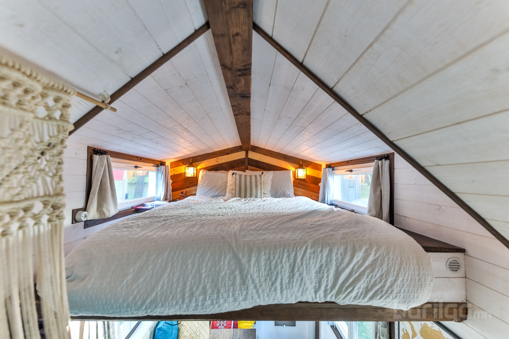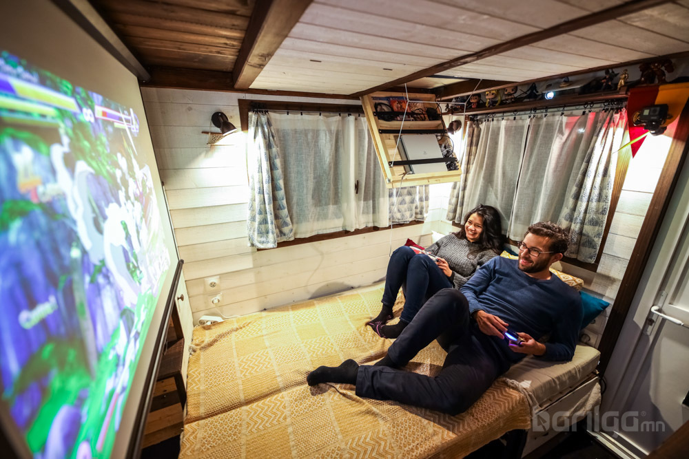 Жижигхэн аяллын байшинд тухтай амарч чадна гэж үү, хэмээн бодож байвал энэ зураг хариулт болно байх. Юнаел “Бид цонхонд дуртай учраас орныхоо хоёр талд цонх хийсэн. Сэрэнгүүтээ л өглөөний өнгө үзэмжийг биширч, хэдэн минут орондоо хэвтэх хамгийн сайхан” гэсэн юм.