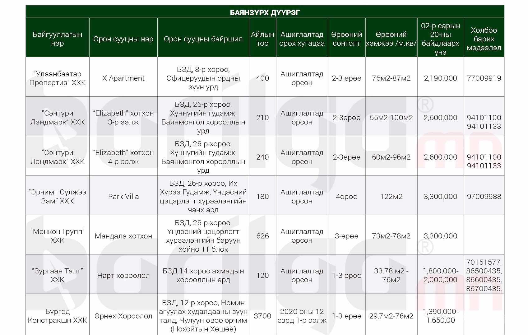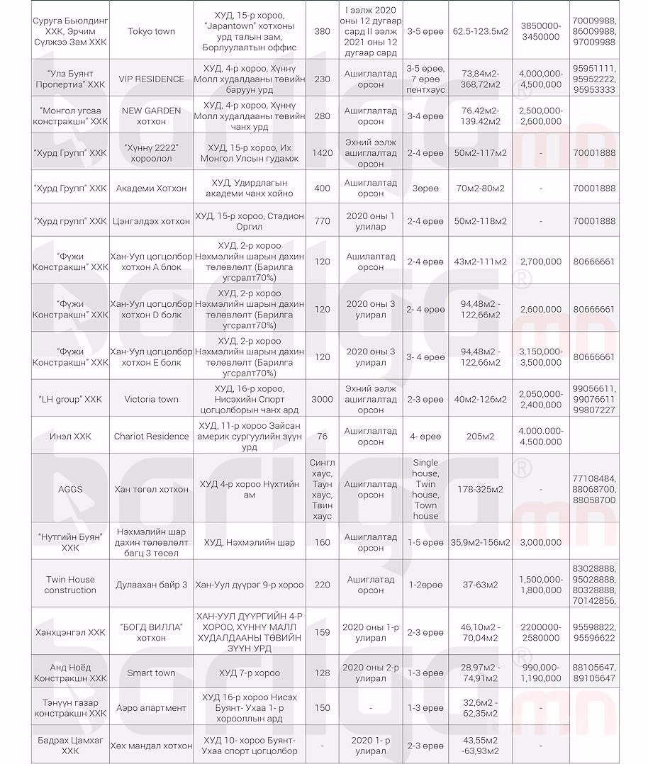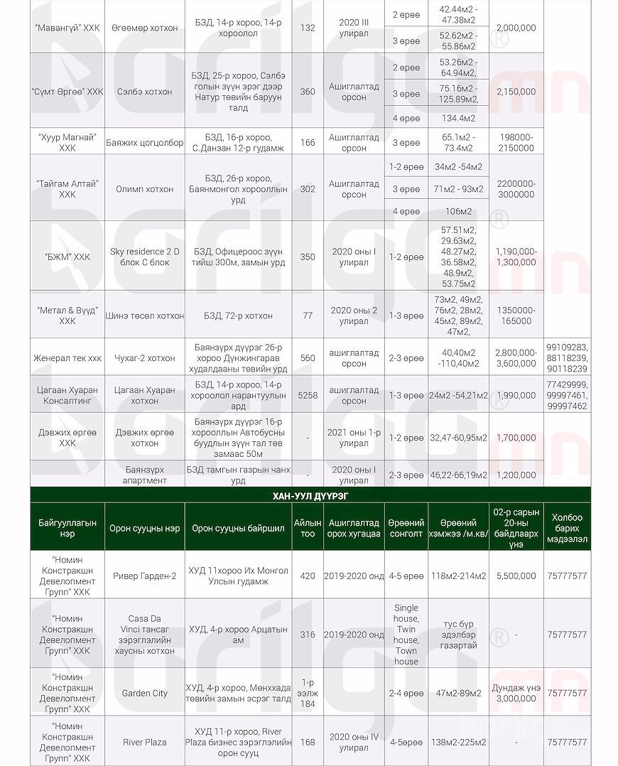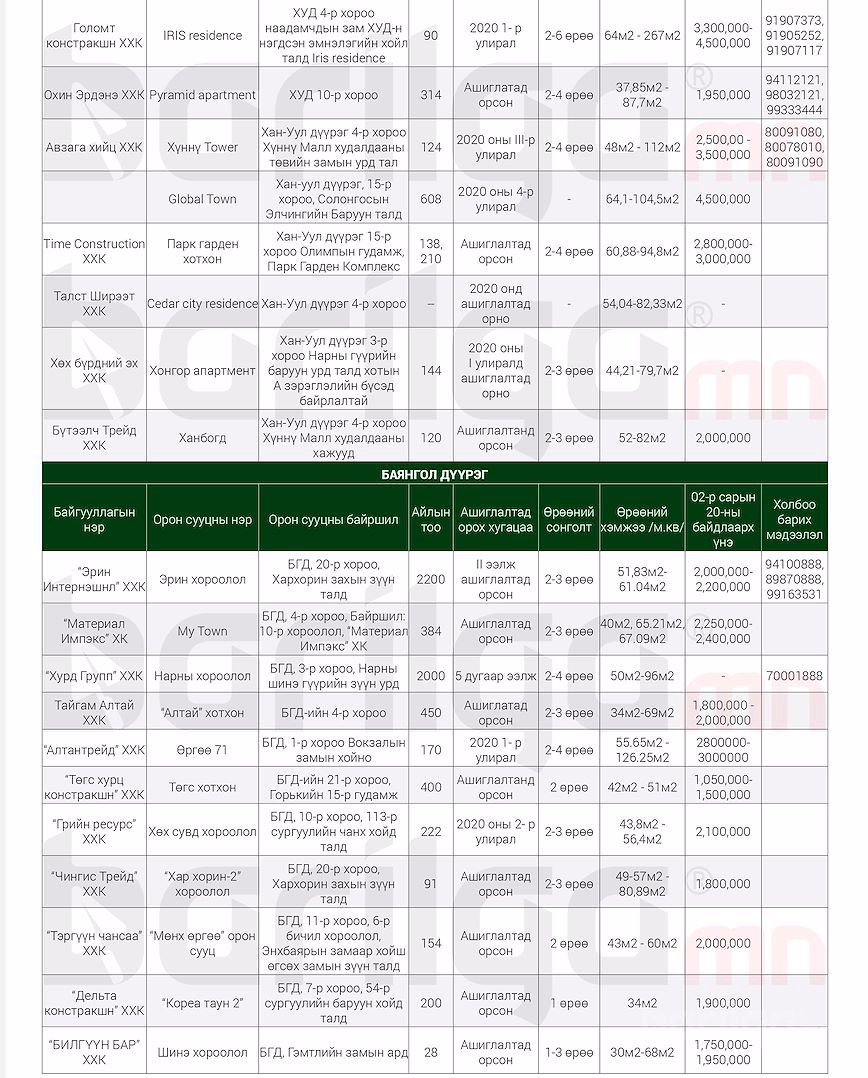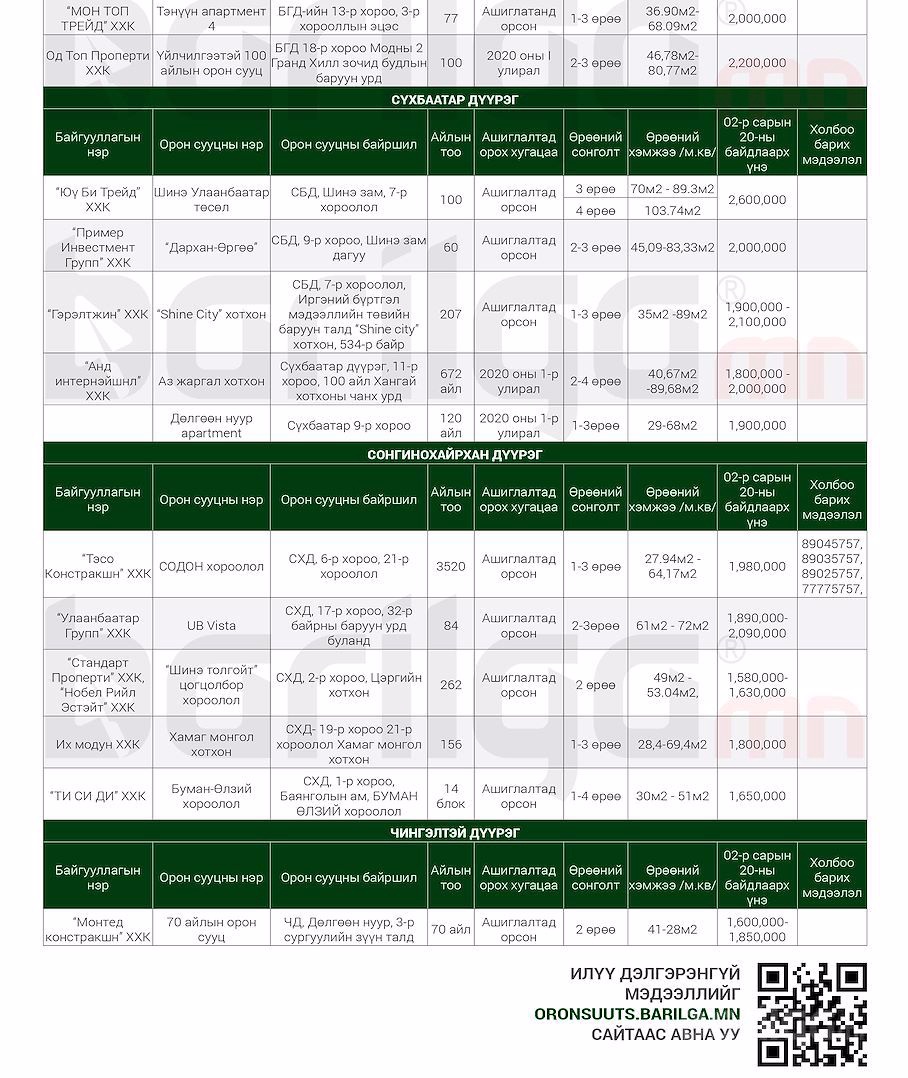 "Барилга.МН" сэтгүүлээс сар бүр хүргэдэг ШИНЭ ОРОН СУУЦНЫ үнэ ханшийн мэдээллийг танд хүргэж байна. Илүү дэлгэрэнгүй мэдээлэл авахыг хүсвэл манай сэтгүүлийн 2020 оны 2 сарын дугаар №118-аас үзэх боломжтой.