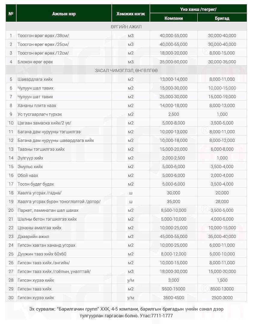 "Барилга.МН" сэтгүүлээс сар бүр хүргэдэг барилгын ажил гүйцэтгэлийн үнэ ханшийн мэдээллийг уншигч танд хүргэж байна. Илүү дэлгэрэнгүй мэдээлэл авахыг хүсвэл манай сэтгүүлийн 2020 оны 2 сарын дугаар №118-аас үзэх боломжтой.