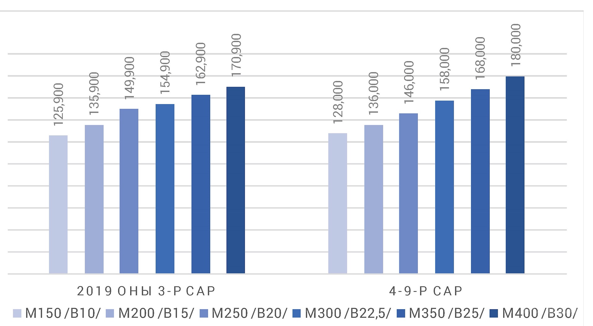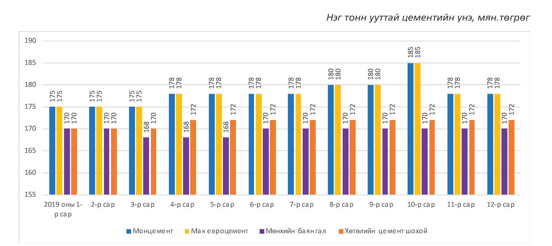 Судалгаанаасхарахад 2019 онд 1 тонн ууттай цементийн Улаанбаатар хот дахь барилгынматериалын захын үнэ 170,000-185,000 төгрөгийн хооронд хэлбэлзэж байсан байна.“Монцемент”, “МАК евроцемент” ХХК-ийн нэг тонн ууттай цементийн үнэ 2019 оны 3-р сарын байдлаар 175,000 төгрөгбайсан бол барилгын үйлдвэрлэлэхэлсэнтэй холбоотой 4-7-р сард 3,000 төгрөгөөр, 8,9-р сард 5,000 төгрөгөөр тустус нэмэгдсэн байна. 2019 оны 10-р сард 1 тонн цементийн үнэ 180,000-185,000төгрөгт хүрснийг эрэлт ихтэй, цементийн тээвэрлэлтийн асуудал удааширсан,валютын ханшийн өсөлттэй холбон тайлбарлаж байна. /Дээрх графикт тухайн сарындээд үнээр нь буюу 10-р сарынх 180,000-185,000 төгрөгт хэлбэлзэж байсныг185,000 төгрөгөөр оруулсан болно/. Харин 11-р сараас үнэ тогтворжиж нэг тоннцемент 178,000 төгрөгийн үнэтэй болсон байна.
