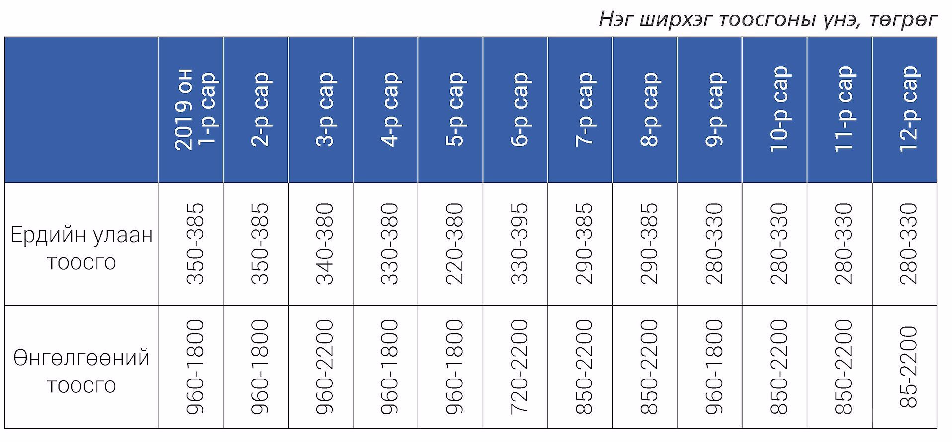 Барилгын үйлдвэрлэлд өргөн ашиглаж байгаадараах 5 төрлийн материалыг сонгон авч 2019 оны 1-12 сарыг дуусталх хугацаанытус сэтгүүлд гарсан дотоодын зах зээлийн үнийг харьцуулан судалгаа хийснийгхүргэж байна. Үүнд: