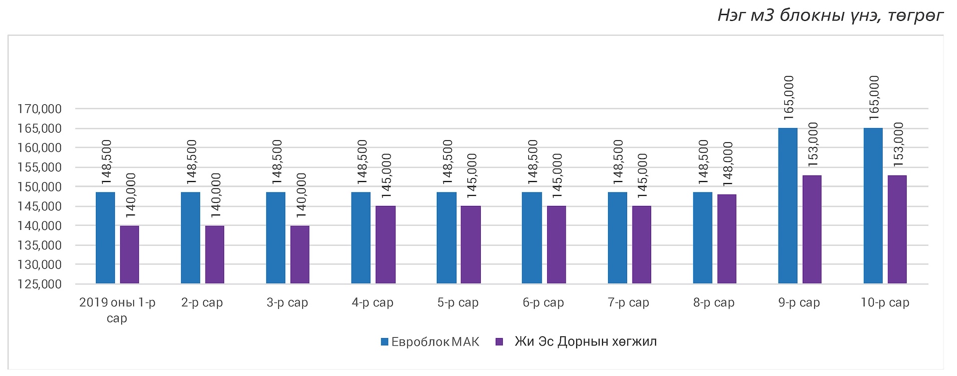 Автоклавын хийт бетон гулдмай буюу блокныүйлдвэрлэл эрхэлж байгаа “МАК евроблок”, “Жи Эс Дорнын хөгжил” ХХК-ийн 2019 оныбайдлаар нэг м3 блокны үнийг судалгаанд хамрууллаа.