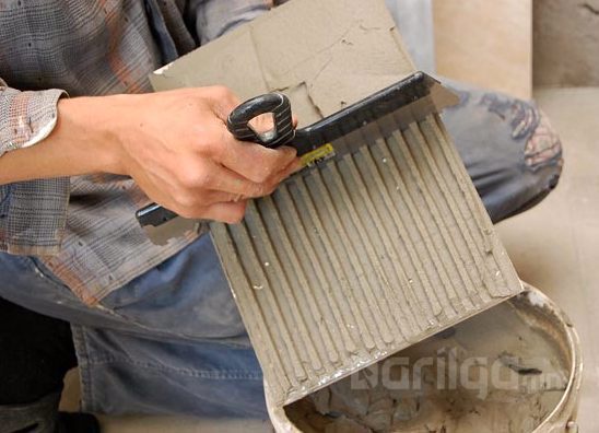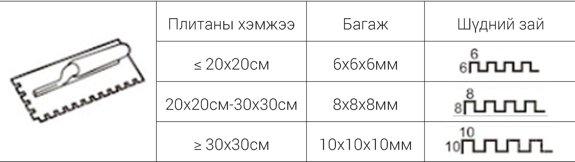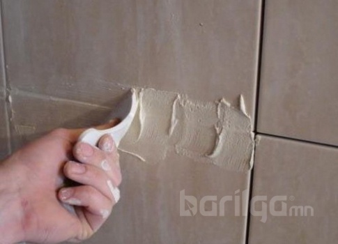 3.Шүдтэй татагчаар гадаргуу болон плитаны ард цавуунаасаа түрхэнэ. Түрхэх зузаан нь гадаргуугийн тэгш байдал, төрлөөс хамаарна. Өрөөний температур, чийглэг хавтанцарын хэмжээнээс шалтгаалж нэг удаагийн цавууны тараах хэмжээг тогтооно.