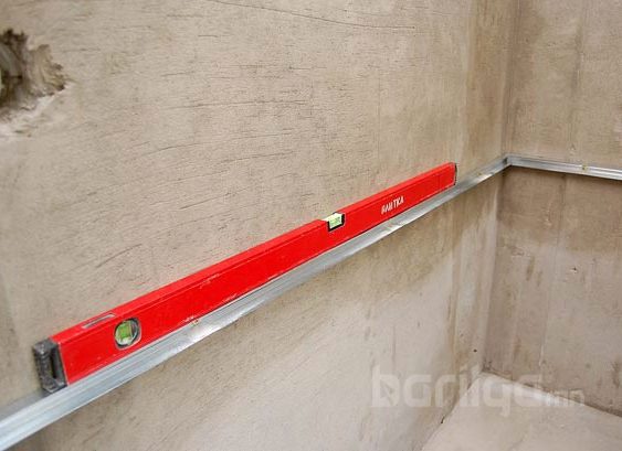2.Плита наах ажил нь ханан дээр тэмдэглэгээ хийхээс эхэлнэ. Ханыг доороос нь хэмжиж нэг плитаны өндрийн хэмжээгээр шугам татна. Энэ шугамын дагуу метал профилийг түр тогтоож плитаг наах нь бэхэлгээ болохоос гадна плитаны тогтвортой байдлыг хангана. Хэвтээ чиглэлийн тэгшийг тэгш усаар шалгах хэрэгтэй. Мөн лазер тэгш усыг ч ашиглаж болно.