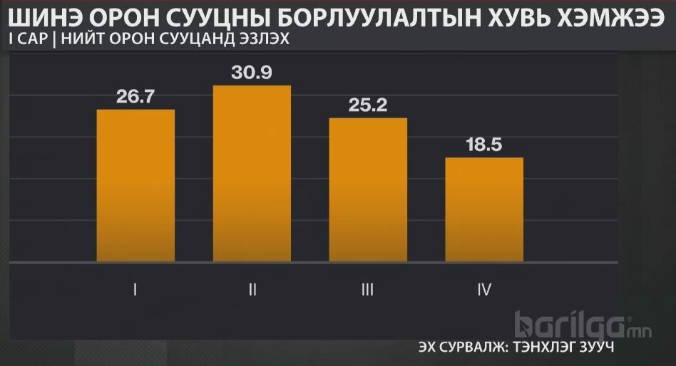 Ашиглалтад орсон 11.2 мянган айлын орон сууц борлогдсон байгаа бол 4262 айлын орон сууц борлогдож амжаагүй байна. Ашиглалтад орох хугацаагаар нь харвал 2020 оны I улиралд ашиглалтад орох орон сууцны 26.7 хувь нь борлогдож, 73.3 хувь нь борлогдоогүй байжээ. Харин III улиралд ашиглалтад орох орон сууцны 25 хувь борлогдсон бол IV улирлынх 19 орчим хувийн борлуулалттай байна.