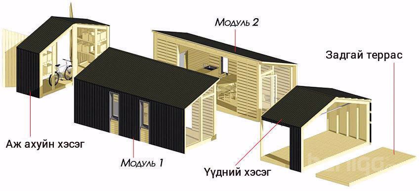 Барилгын үндсэн хийц ньмодон двутавр рамтай шилэн хөвөн дулаалгатай шахмал хавтан хашлагатай элементүүдээс (шал, хана, тааз болон дээврийн хавтгайлжууд) бүрдэх бөгөөд нийлүүлж угсарсан хамгийн бага нэгжийг модуль гэж нэрлэнэ. Хэд хэдэн модулийг зэрэгцүүлэн болон давхарлан угсарч томоохон хэмжээний барилга барих боломжтой бөгөөд нэг модулийн дундаж хэмжээ нь 26м2 байна. Гадна ба дотор өнгөлгөө нь гал болон усанд тэсвэртэй хавтан байх бөгөөд захиалагчийн хүссэн өнгөөр будах боломжтой. Модулийг бүтнээр нь тээвэрлэх бөгөөд нэг модулийг бэлдэх хугацаа7-10 хоног байна. Үнийн хувьд үндсэн хийцийг угсрахад 1м2 нь 750,000-800,000төгрөг байна. Үүнд: зураг төсөл, үндсэн хана, шал, дээврийн бүтээцүүд, дулаалга, өнгөлгөөний хавтангууд, доторлогоо, черепиц дээвэр, гадна хаалга, 3 давхар шилтэй хуванцар цонх угсрах, гадна талыг будах, үйлдвэрийн талбай дээрх угсралт орсон юм. Харин бүрэн гүйцэтгэлтэй, ариун цэврийн өрөөтэй, шалны халаалттай, захиалагчийн газар дээрх угсралтыг хийж гүйцэтгэхэд 1м2 нь1,200,000 төгрөг орчим болно.
