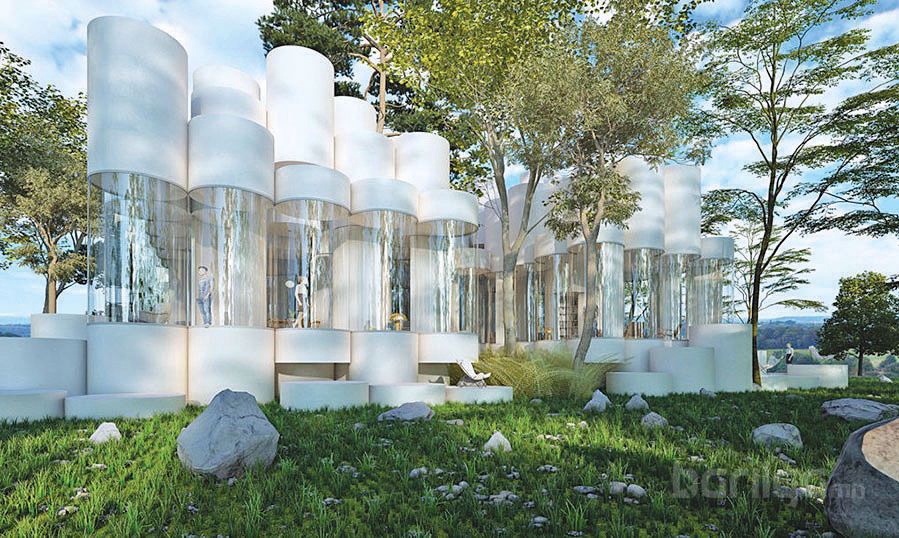Эрүүл эко орчинг бүрдүүлж,Лион хотын захын ойд байрлуулсан энэхүү модулин хаусыг Францын архитектор Кирил Ланцелин бүтээжээ. Барилга нь уламжлалт загвараас татгалзаж шилэн цилиндр хэлбэртэй модулиуд дээр суурилдаг. Бүтэц нь шилэн, бетон цилиндрийн нягтрал бөгөөд модулиудын ийм ер бусын хэлбэр нь хөнгөн, байгалийн гэрлийг бүрэн дүүрэн ашиглах боломжтой, гадна, дотоод засал чимэглэлийн хоорондох ялгааг арилгаж, оршин суугчдад гайхалтай, сэтгэл татам орчинг бүрдүүлдэг. Архитектор барилгыг өргөтгөх боломжийг бүрдүүлэхийн тулд цилиндр хэлбэрийн системийг ашигласан бөгөөд функц, байршлаас нь хамааран илүү нээлттэй, хагас нээлттэй, хаалттайгаар шийдэж болно.