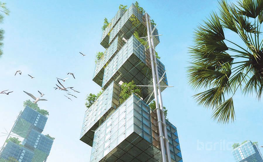Алдарт архитектурын компани Weingartner Architect нь эко өвөрмөц тэнгэр баганадсан төслийг боловсруулсан бөгөөд гол санаа нь хотжилт, хотын хязгаарлагдмал нөөц зэрэг хүнамын өсөлтийн сөрөг үр дагаврыг шийдвэрлэх гарцыг шийдсэн юм. Энэ барилга ньбетонон суурь, багана дээр автомашины газар доорхи зогсоол, нийтийн эзэмшлийн талбай, шат, таван цахилгаан шат, цахилгаан угсралтын шугам, усан хоолойн зориулалттай шат зэрэг тоног төхөөрөмжүүд байрладаг ба барилгын материалын 70 орчим хувьд нь модыг ашигласнаар эрүүл эко орчныг бүрдүүлж чадсан байна.
