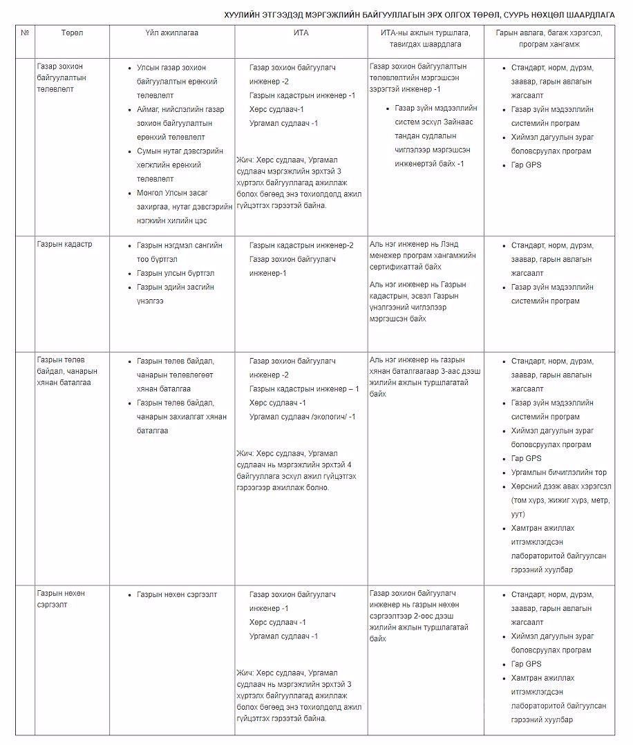 •Барилга байгууламжийн зураг төсөлд магадлал хийх чиглэл тус бүрээр 2-оос доошгүй орон тооны эксперттэй байх бөгөөд хөдөлмөрийн гэрээ байгуулсан байх