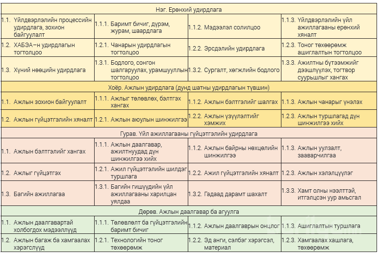 - Байгууллагын удирдлага зохион байгуулалт;