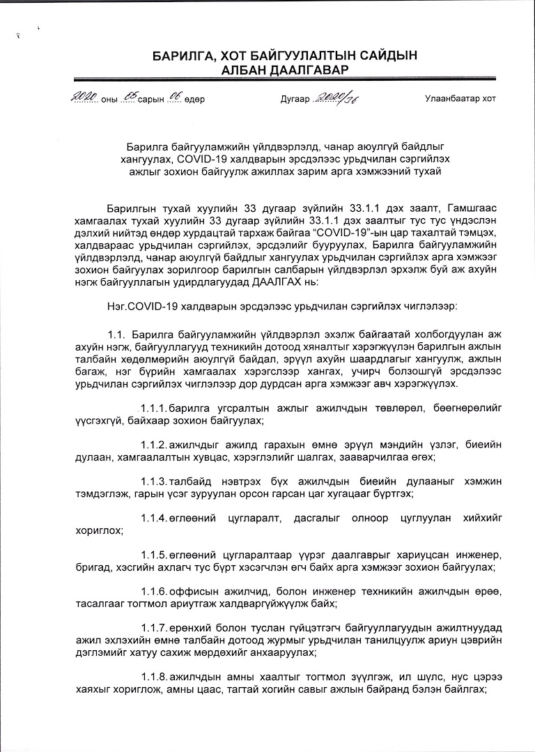 Барилга байгууламжийн үйлдвэрлэлд, чанар аюулгүй байдлыг хангуулах, COVID-19 халдварын эрсдэлээс урьдчилан сэргийлэх ажлыг зохион байгуулж, ажиллах зарим арга хэмжээний тухай Барилга, хот байгуулалтын сайдын албан даалгавар гарлаа.