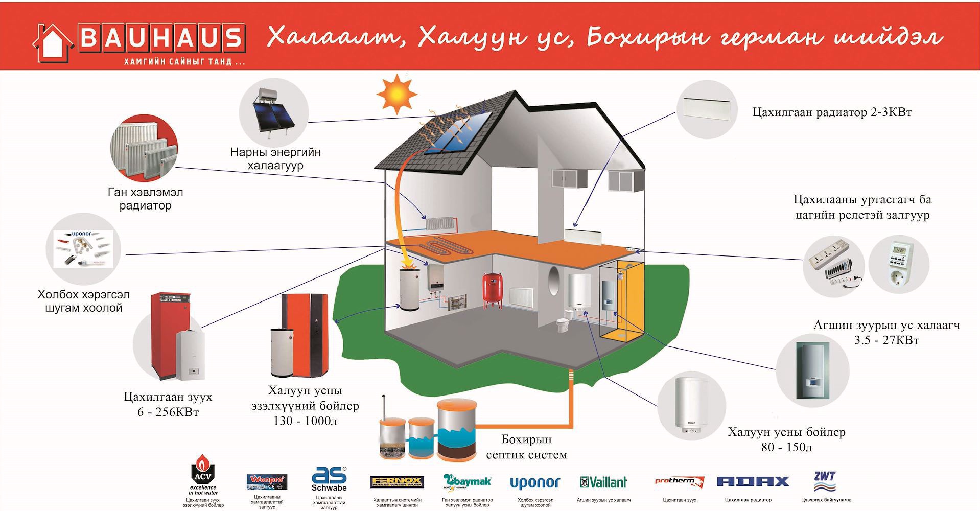 Орон сууцнууд бол төвлөрсөн усан хангамж, бохир усны систем болон дулаан хангамжид холбогдсон байдаг. Дулааны станцаас халаалт, халуун усаа авч, ахуйн бохироо төв цэвэрлэх байгууламж уруу илгээдэг гэсэн үг л дээ. Тэгвэл энэхүү процессын жижигрүүлсэн хувилбар буюу хэрэглэгч өөрөө бие даасан дэд бүтцийг шийдэхийг амины орон сууцны халаалт, халуун ус, бохирын цогц шийдэл гэж хэлж болно. Халаалтын цахилгаан зуух бол тухайн байшингийн дулааны станц юм. Зуухыг худалдан авахдаа байшингийн эзэлхүүн, хийц, дулаан алдагдлаас хамаарч тохирсон хүчин чадалтайг сонгох хэрэгтэй байдаг. Жишээлбэл, 4 - 6 хүн амьдардаг 100 м2 байшинд 380 - д холбогддог 14 квт -ын хүчин чадалтай цахилгаан зуух тавигдаж болно. Зуухнаас өгөх буцах шугам хувиарлагч дээр очиж, хувиарлагчаас хос шугамууд ган хэвлэмэл радиотор буюу халаах хэрэгсэл дээр хүрч халаалтыг халаалтыг дамжуулна. Радиотор /паар/ - т өвлийн улиралд хөлдөхөөс сэргийлэн ахуйн тосоолыг хийдэг.