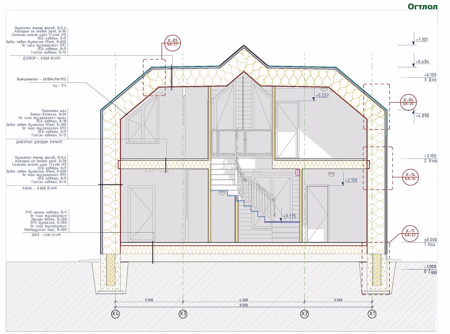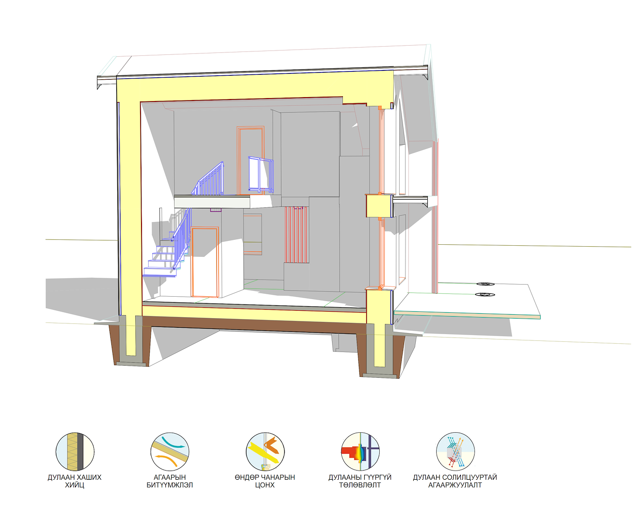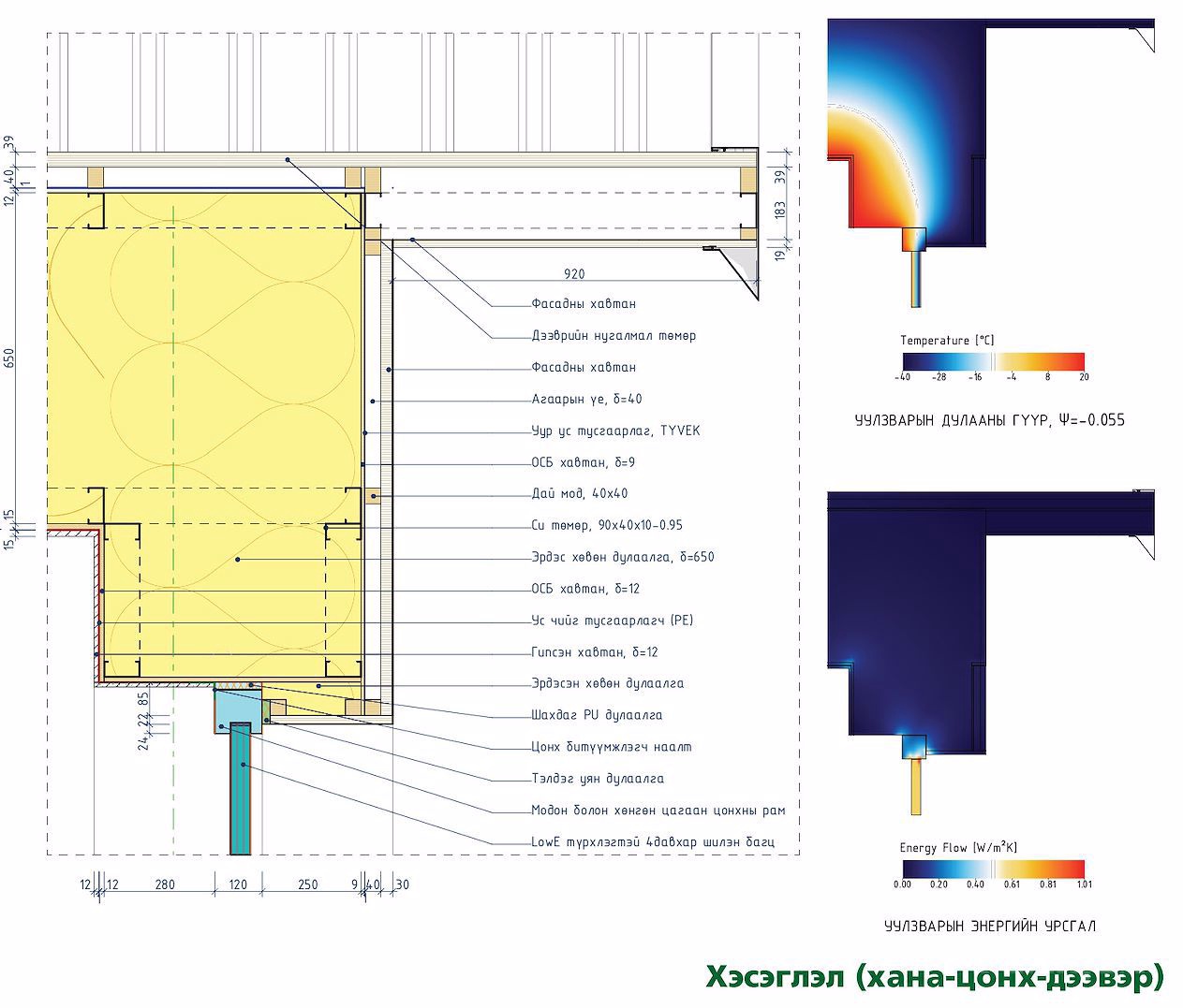 Дулаан алдагдал өндөртэй барилгын хашихбүтээцийн залгаасууд болох суурь, хана, шал, хучилт, дээврийн уулзваруудыгΨ<0.001В/мК буюу дулааны гүүргүйгээр төлөвлөв.