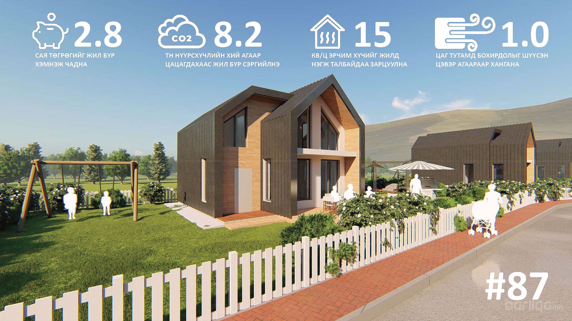 "Ногоон хотхон"-ы 87м2 амины сууц ньтэнхлэгээрээ 9,5м*7м хэмжээтэй ба эрчим хүчний хэмнэлттэй /пассив хаус/ байлгахзорилгоор архитектурын болон инженерийн шийдлүүдийг төлөвлөсөн.