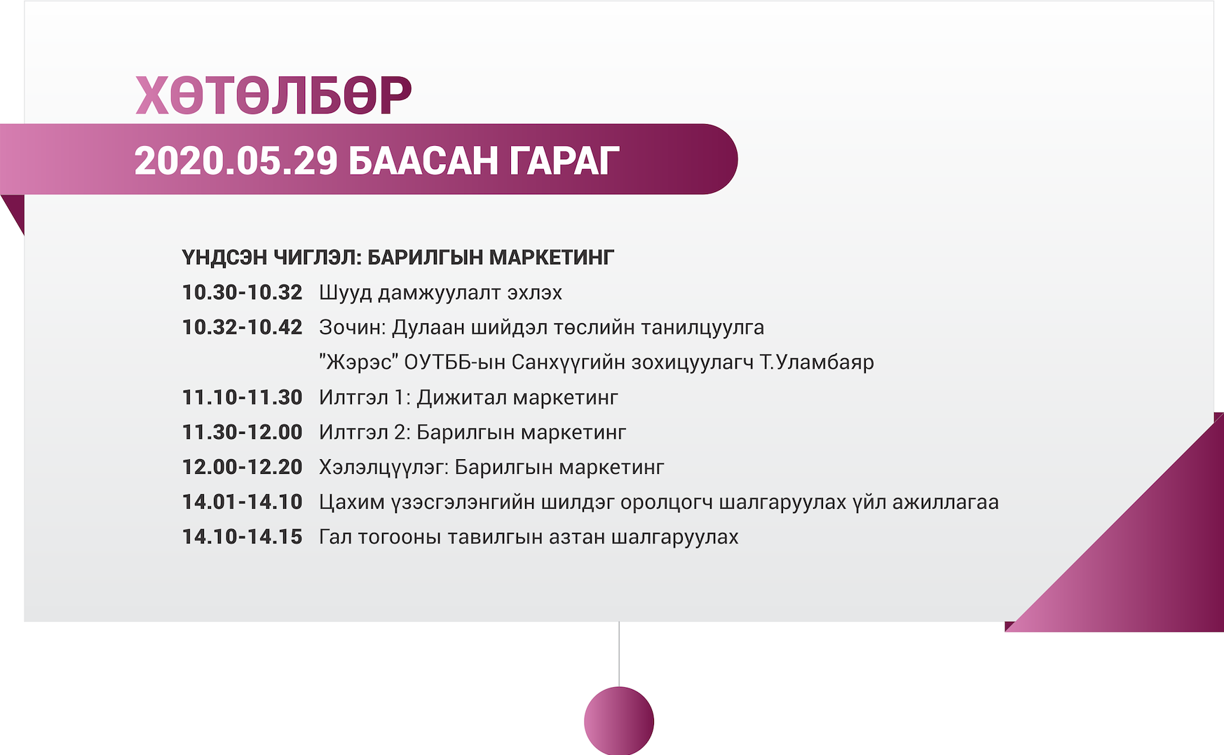 Өнөөдөр “Барилгын маркетинг” гэсэн сэдвийн хүрээнд мэргэжилтнүүд, холбогдох албан тушаалтнуудын илтгэл, сургалт, хэлэлцүүлгүүд barilga.mn пэйжээр шууд Live -аар дамжуулагдан хүрнэ. Тухайлбал,
