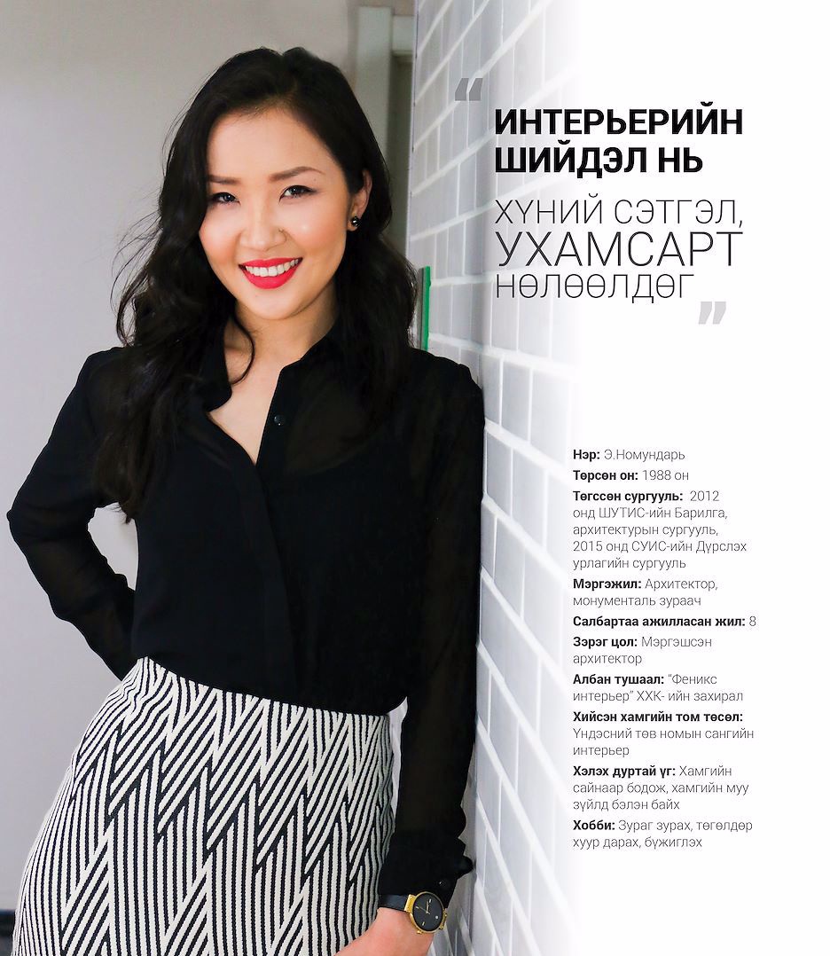 Интерьерийн чиглэлээр 8 гаруй жил ажиллаж байна. Мэргэжил минь надад цагтутамд суралцаж, өөрийгөө байнга хөгжүүлж байхыг ойлгуулсан. Олон хүнтэй харьцаж, юмыг олон талаас бодож, илүү хариуцлагатай хүн болгосон гэж боддог. Ээж минь архитектор мэргэжилтэй, ээжтэйгээ адил багаасаа зураг зурах дуртай байсан нь архитектор, зураач мэргэжил сонгоход нөлөөлсөн гэж бодож байна.