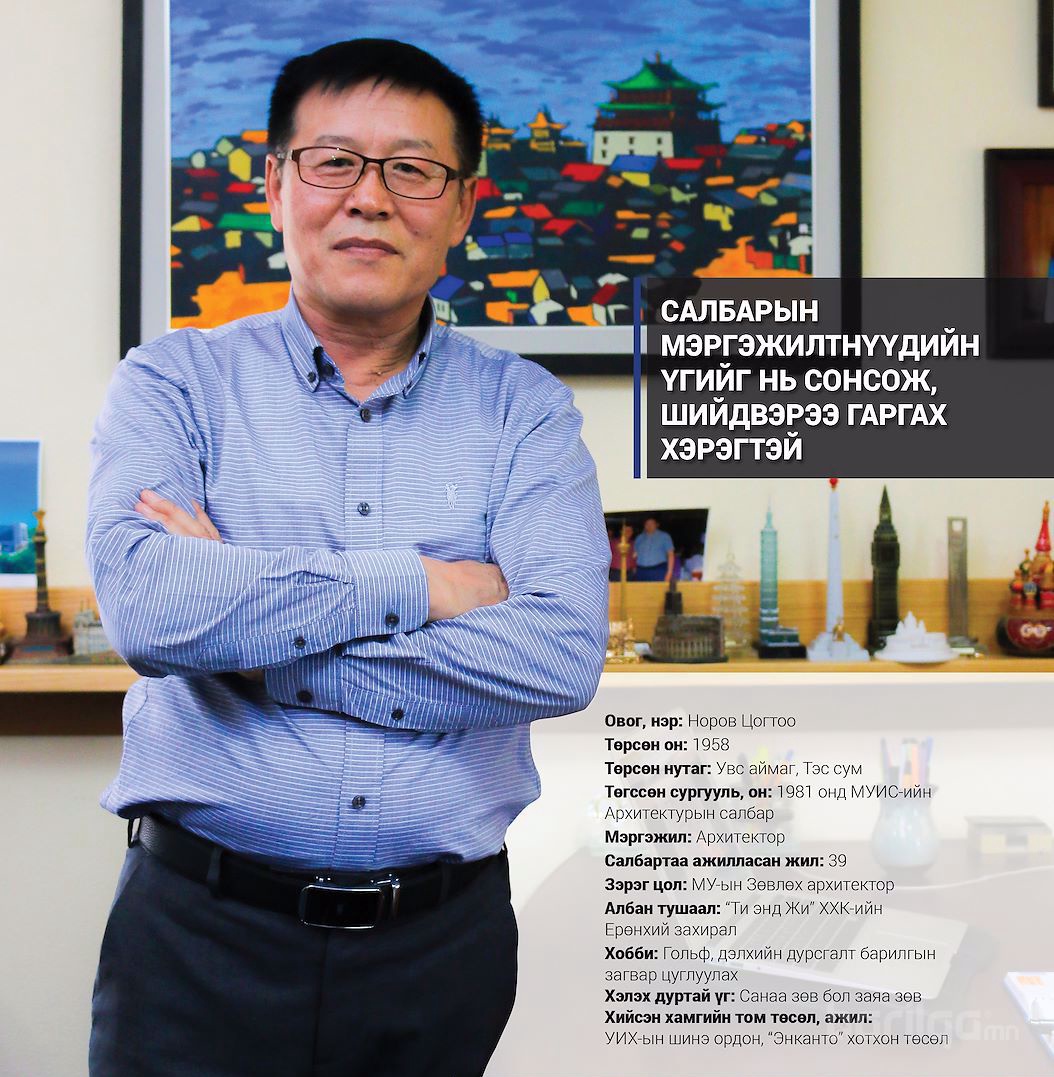 Би 1981 онд сургуулиа төгсөөд Барилга-архитектур, техник хяналтын улсын хорооны дарга С.Лувсангомбо гуайн томилолтоор Завхан аймагт Барилгын улсын байцаагчаар ажиллаж байлаа. Дараа нь Булган аймагт архитектор, аймгийн барилгын хэлтэс, захиалагчийн товчоонд дарга гэх мэтээр орон нутгийн бүтээн байгуулалтанд оролцон 10 аад жил ажиллаж байгаад, зах зээлд орж эхлэх үед Улаанбаатар хотод орж ирсэн. Нэг хэсэг барилга дээр инженерээр ажиллаж байлаа. 90-ээд оны эхээр бусдын адил гэр бүлээ тэжээх, зах зээлийн нийгэмд орох үед залуу насны эрч хүчээр түүчээлэх гэж наймаа хүртэл хийж л байлаа. 1996 оноос өөрийн сурсан, хийх дуртай зүйлээрээ бизнес хийе гэж шийдээд барилгын зураг төслийн чиглэлээр “ Ти энд Жи” компаниа байгуулж, одоог хүртэл үр бүтээлтэй ажилласаар ирлээ. Эзэмшсэн мэргэжлээрээ салбартаа 39 жил ажиллаж , архитектор хүний туулах ёстой замаар явж ирсэн гэж боддог.
